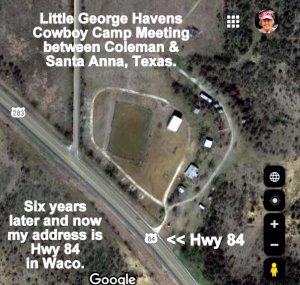 As I researched and prepared this message, a smile came to my face as I observed the location of the Little George Havens’ Cowboy Camp Meeting. It is on Highway 84 between Santa Anna and Coleman, Texas. All these years later, now my address is Highway 84 in Waco, Texas.