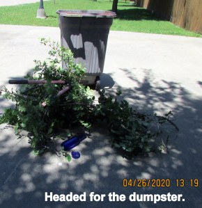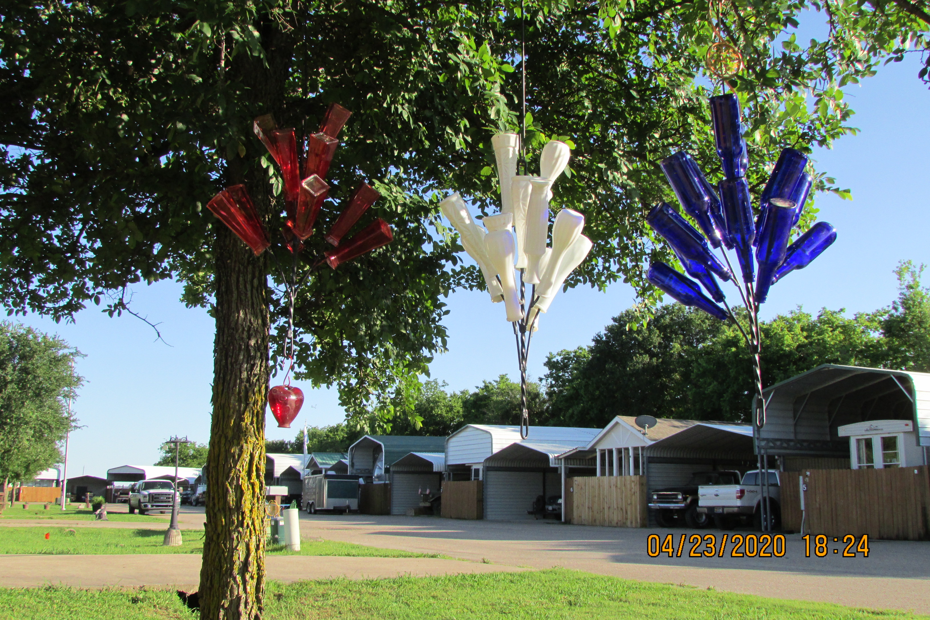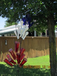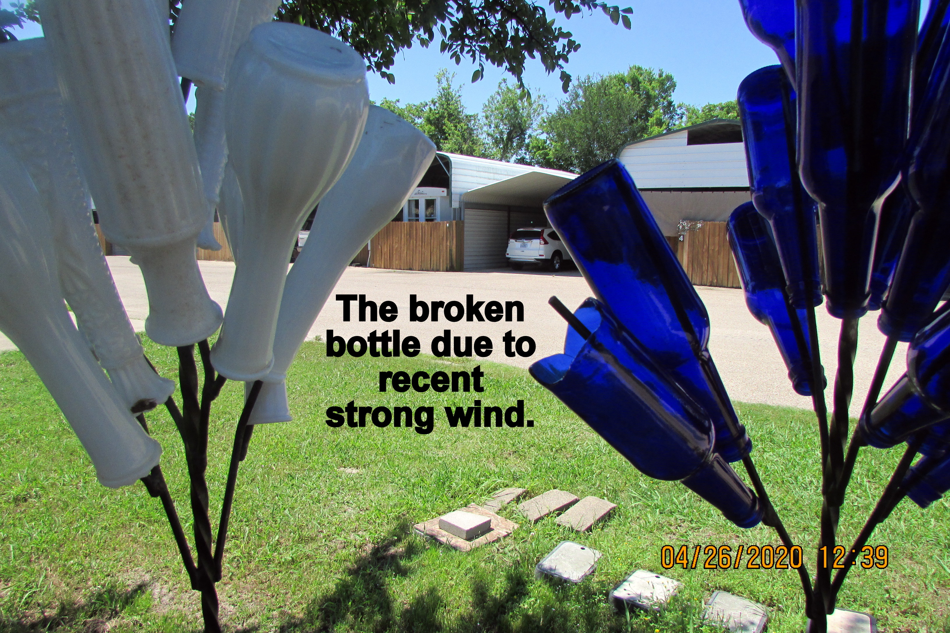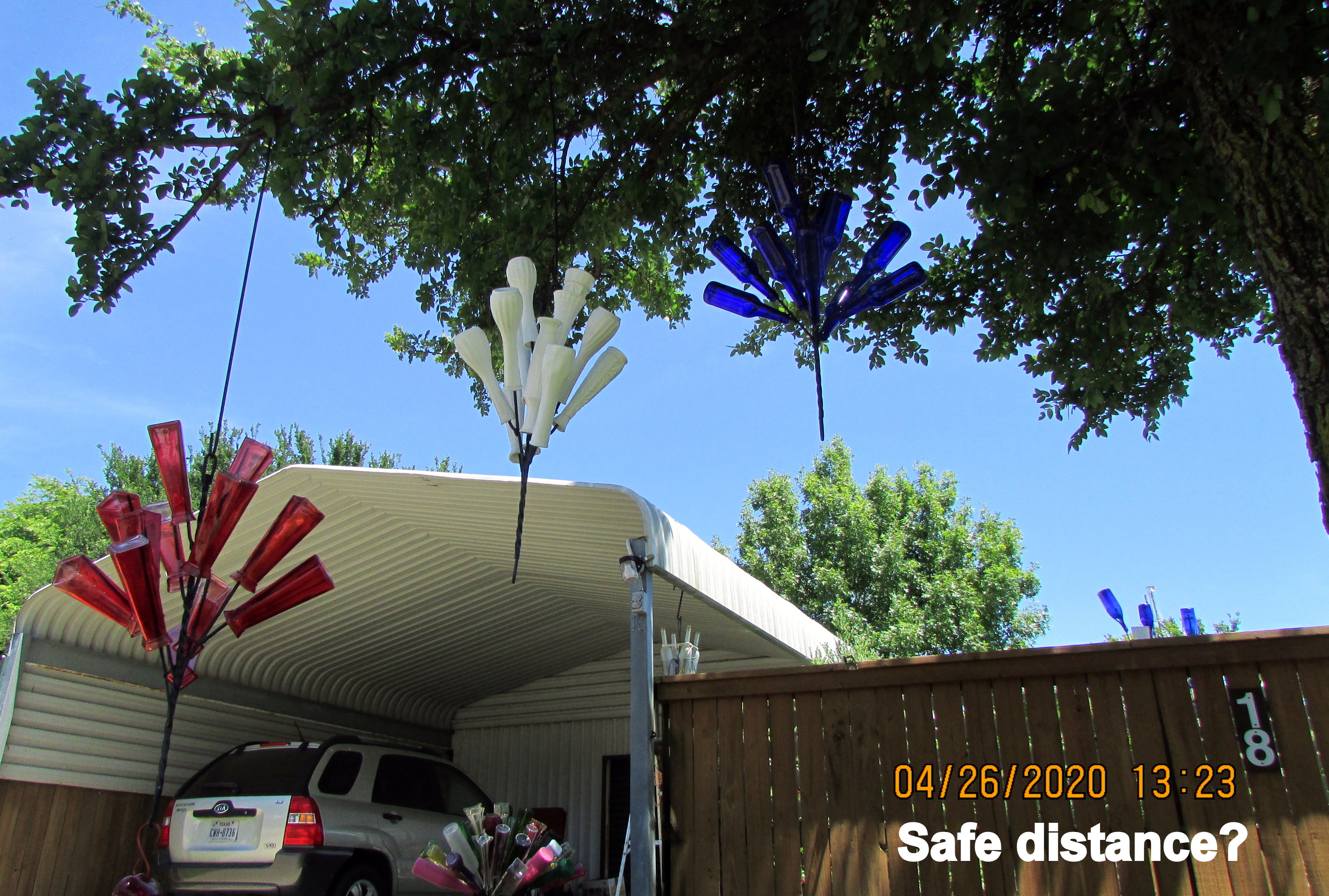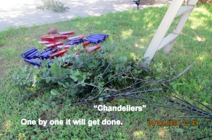 A couple of days ago, we had a strong wind. I had the thought: “It will be a miracle if bottlesdon’t get broken.” On this very pleasant sunny Sunday afternoon I checked… and then started the process of moving the “chandeliers” further apart. Before & after pictures; colors are reversed.