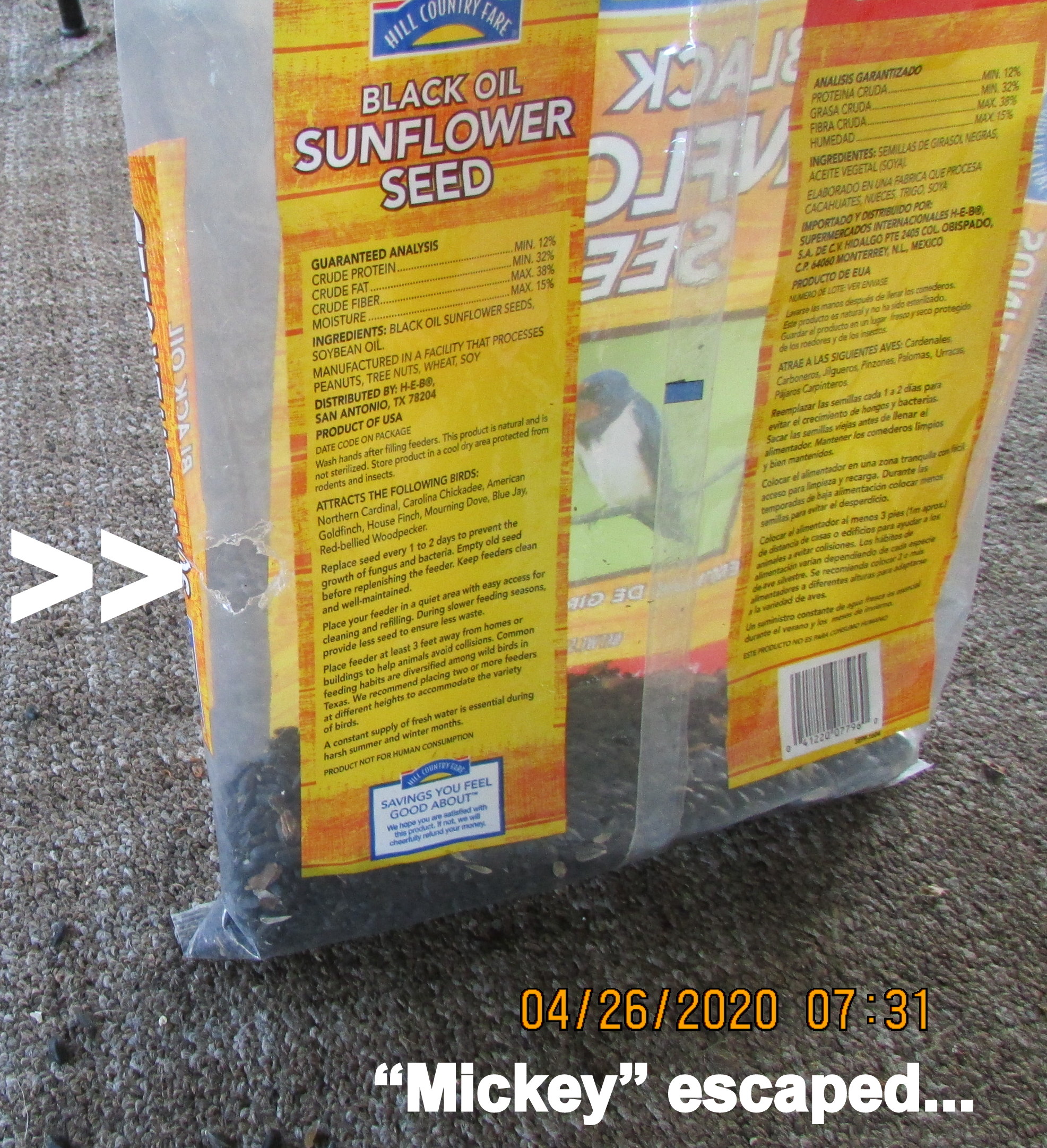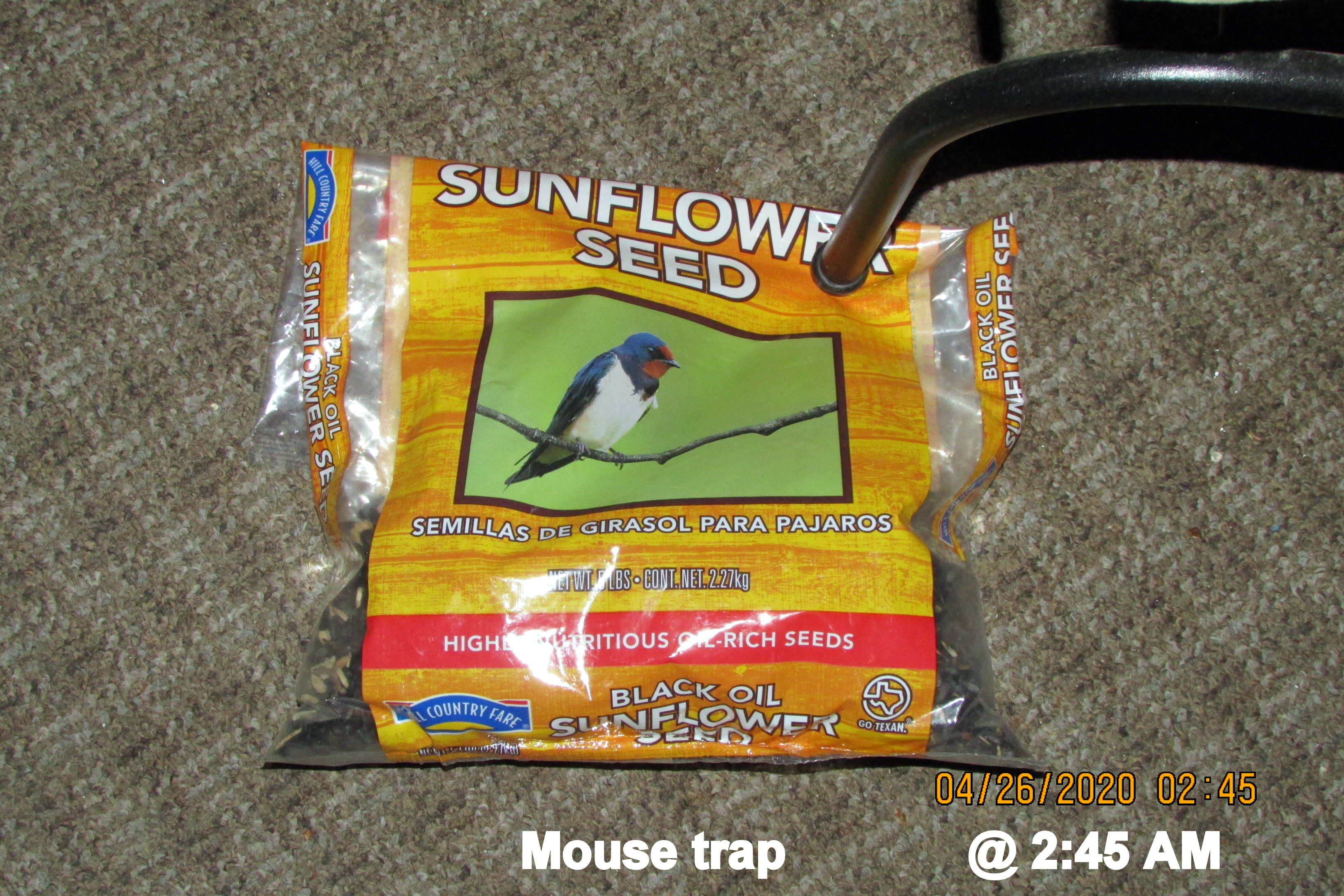 It was eerily quiet when I got up at two-thirty this morning. No traffic on the highway. Then I heard that strange sound again. A “crackling sound.” Frequently, without the noise of the television, I’d wonder “what’s that strange sound?” I’d search… without success. TODAY, I discovered a mouse in the bag of bird food sunflower seeds. I “trapped” the mouse and it will suffocate in that bag. I kept the bag indoors so a raccoon wouldn’t get it outdoors. I never dreamed I’d have a mouse in the house.