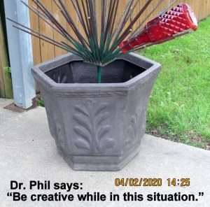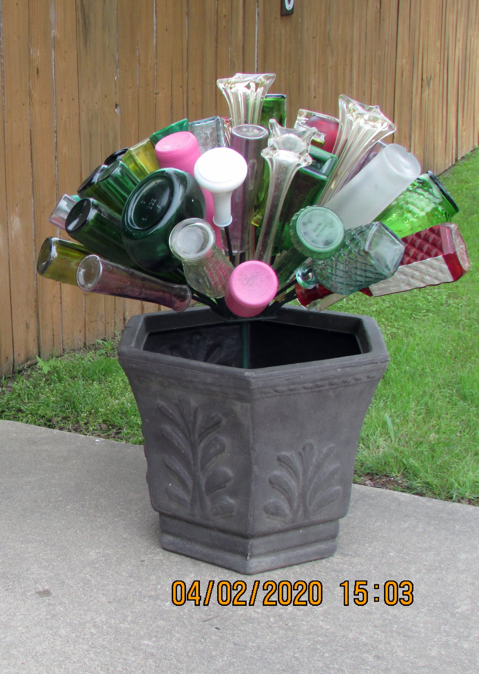 “Rain” drove me indoors and I was watching Dr. Phil’s program. At 3:57 PM, he said: “Be creative while in this (Coronavirus) situation.” I found that comment so reassuring because working with “bottle trees” is being creative!!