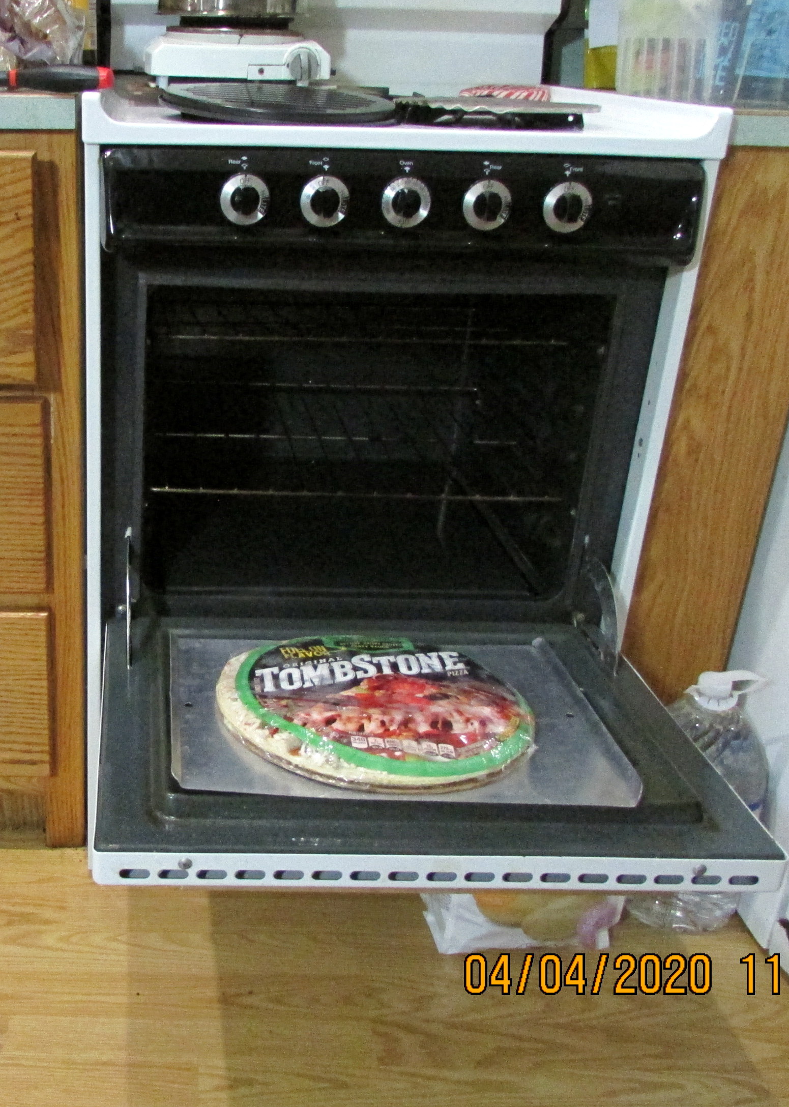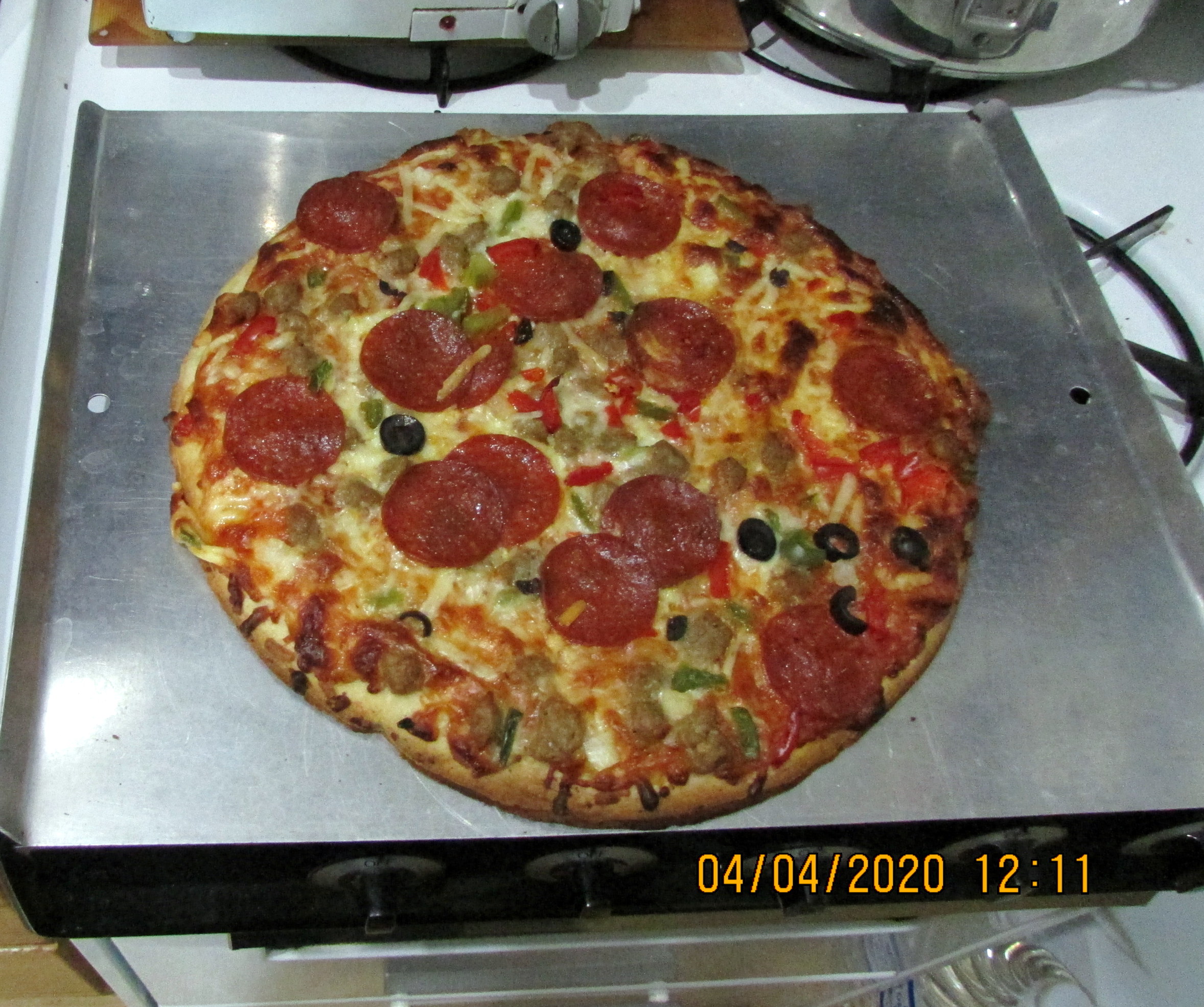 It has been more than six years since I used an oven!! Ovens have been another “storage” area. Today I am so hungry for “comfort food,” I’m enjoying a Pizza that clearly is not vegetarian. The neighbor brought a liter bottle of Coke, too, so I am “dining in.” I never drink Coke. But I gotta be honest: This Supreme Pizza and Coke taste delicious (at 12:12 on 4/4)!