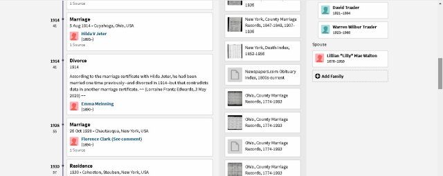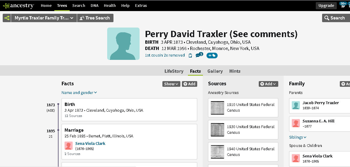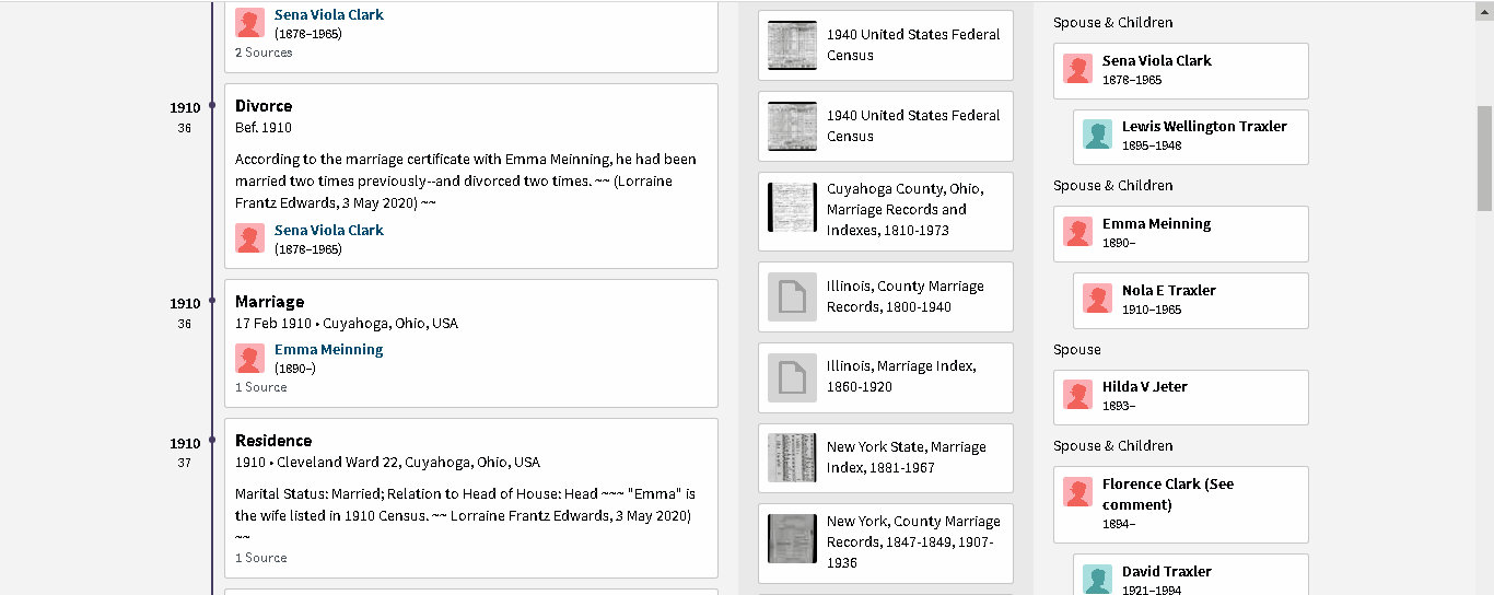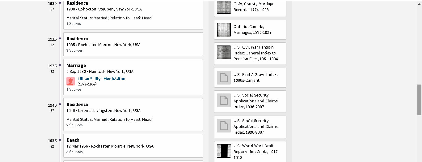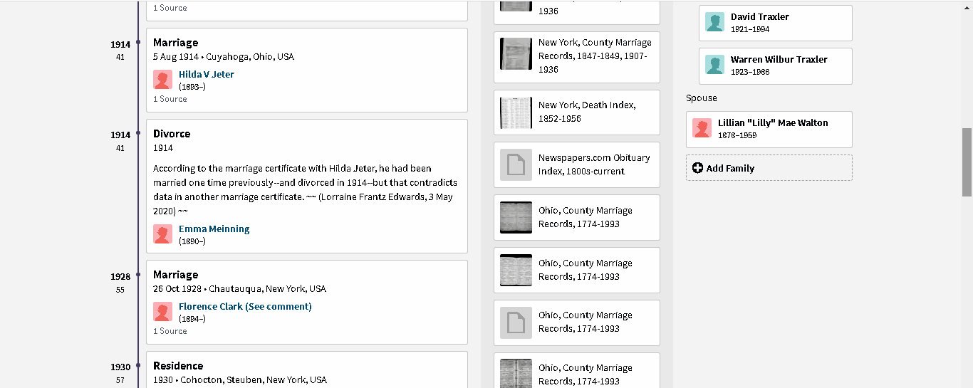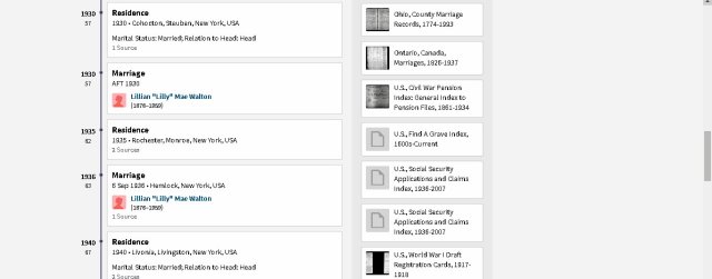 Many years ago there was a radio program titled “One Man’s Family.” I’ve spent an entire day with this “one man” and his family. As you look at the images, consider how complicated it was to sort out the wives. Searching “sources” for the children helped provide the answer to their mother. Frequently they appeared in Census records with the woman who was actually their step-mother. I love the “detective work” and this is my gift to future researchers of this branch of the family tree. (Comparing this with other Member Family Trees, I see careless mistakes. I strive for 200% accuracy! Because I see where “Member Family Trees” copy one another, I speculate “they” don’t spend an entire day accurately documenting the family structure.) ~~ This is one illustration of the “furnishings” added to “one-room” of the mansion I inherited. ~~ There is an “overlap” of images because (understandably?) too long for one illustration. ~~”One man’s family”: Father, mother, five wives, four children, two step-children, ten in-laws, and twenty-two sources. Lest I forget: Spouses and children of former wife’s subsequent marriage. 😉