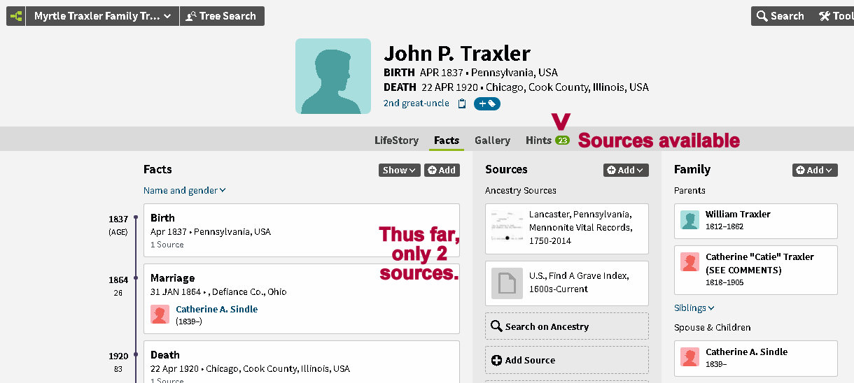 Imagine for a minute, the length of time it takes to add those “hints” (those “sources”) to an individual. Multiply that by 75,000 individuals and the reader can understand the magnitude of the project. Eventually (“painting by number”) it will be a lush green tree.