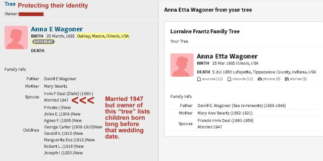 It was with reluctance that I accepted that “Irvin” looks like “Irving Deal” on the death certificate for his wife Anna Wagoner Deal born 25 Mar 1885 and died 5 Jul 1960. When did they marry? I spent hours searching for a record using alternate spellings and various locations. One Ancestry Member Family Tree lists the marriage on 20 Jul 1947 but no source. (I want “sources.”) I’m accepting that date because it came from a grand-nephew who probably has “inside information.”