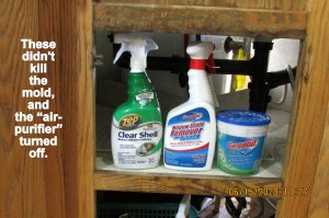 Morning not going well? I can smell the mold and mildew!! I “know” it is detrimental to my health!! The “inhibitors” (products) don’t seem to be “inhibiting.” What’s the old lady supposed to do?? I have not used the EcoQuest air purifier but plan to move it outdoors (to the porch) and aim it at the kitchen wall. I may still smell the ozone; I may get sick again? I have to make one more attempt… Furthermore, I can’t stand the odor of bleach or I would spray the visible mold. The weather is hot (and humid) and mandates that I use the air-conditioner. If cooler weather, I could have doors and windows open when using bleach.