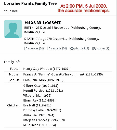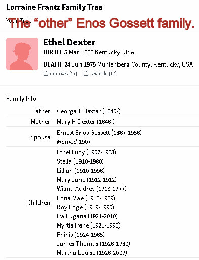 Yes, ultimately I searched for a second man named “Enos Gossett” and found Ernest Enos Gossett. Finally I had the accurate family structures and it led me to Nancy Shank (my fourth-cousin-one-time-removed).
