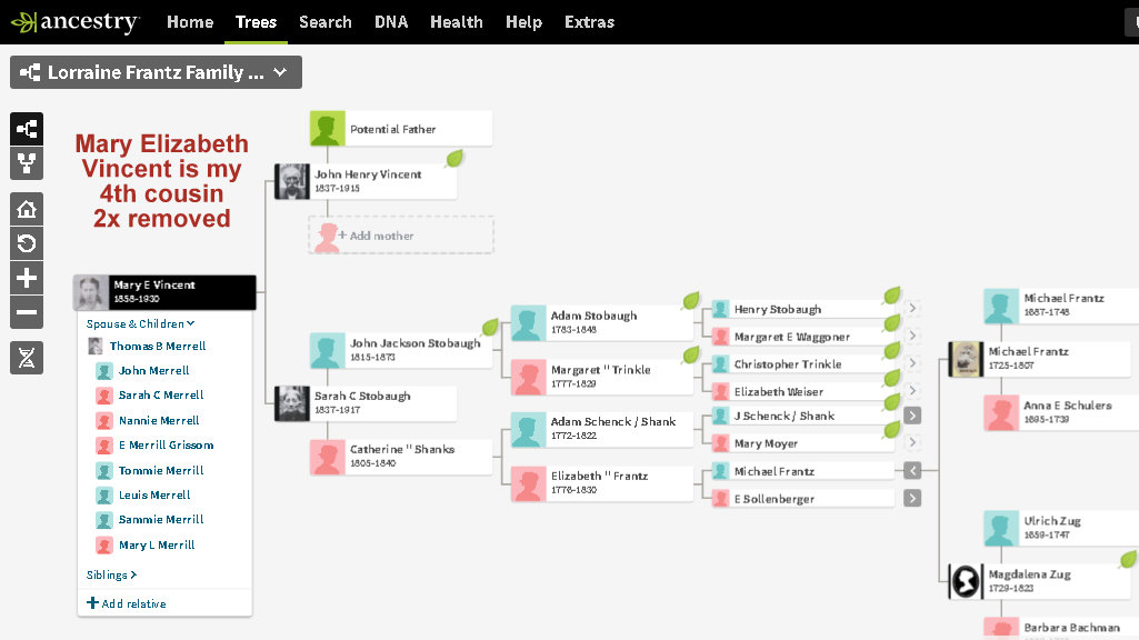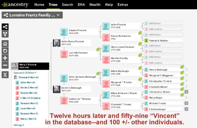 Very recently, I signed an email message “brain drain Lorraine” with this image. That night I was dreaming about my ancestry. A name came to mind and I was “working” that family. When I awakened (in the middle of the night) I immediately ran (walked) to the living room and wrote down the surname “Vinson.” The first thing I did after I got up for the day was look up “Vinson” in my Ancestry.com database. Gospel truth: I had limited “sources” regarding Mary Elizabeth and her surname is “Vincent.” ~~~ I marvel that a tired old (85 years) brain was working like a computer. Is it safe to say that “brain” wants to comply with Lorraine’s very vocal declared desire to have her database 200% accurate?
