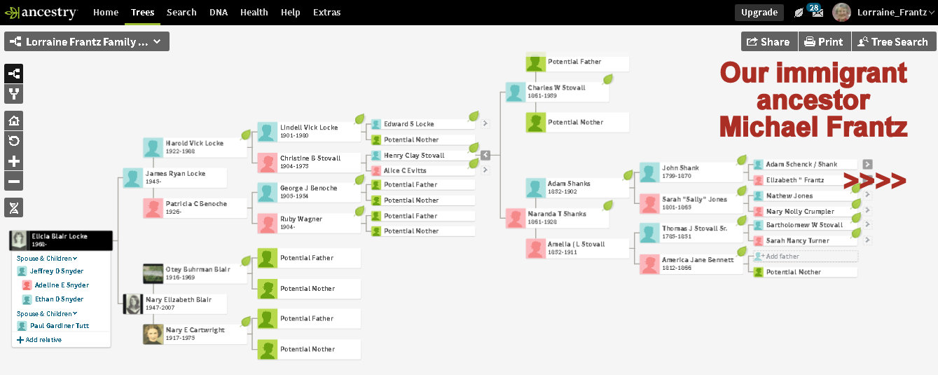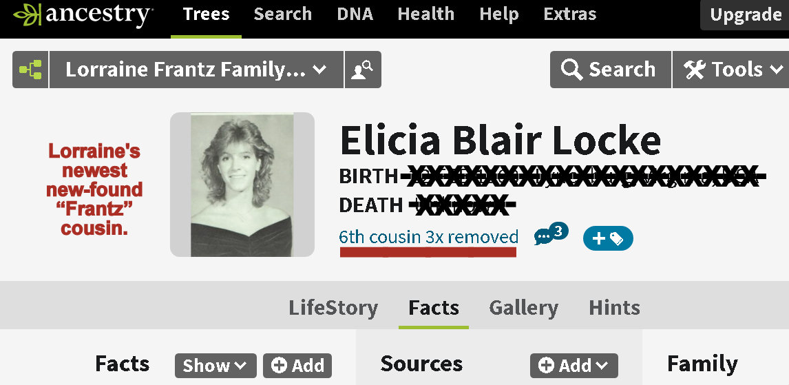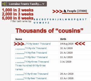 I’m forced to leave my computers for several days. I’ll check my email but Ancestry will have to wait until next week. Why? Because my WiFi “receiver gizmo” wore out—for the desktop computer—and I rely on the “desktop” with the large-screen monitor. Speaking of “forced”: That’s what the tree-climber—with limited vision—had to do to achieve the remaining few individuals to reach 37,000 names. Frankly, laptop computer screens are “too small” for Lorraine. New “gizmo” due to arrive on Monday.