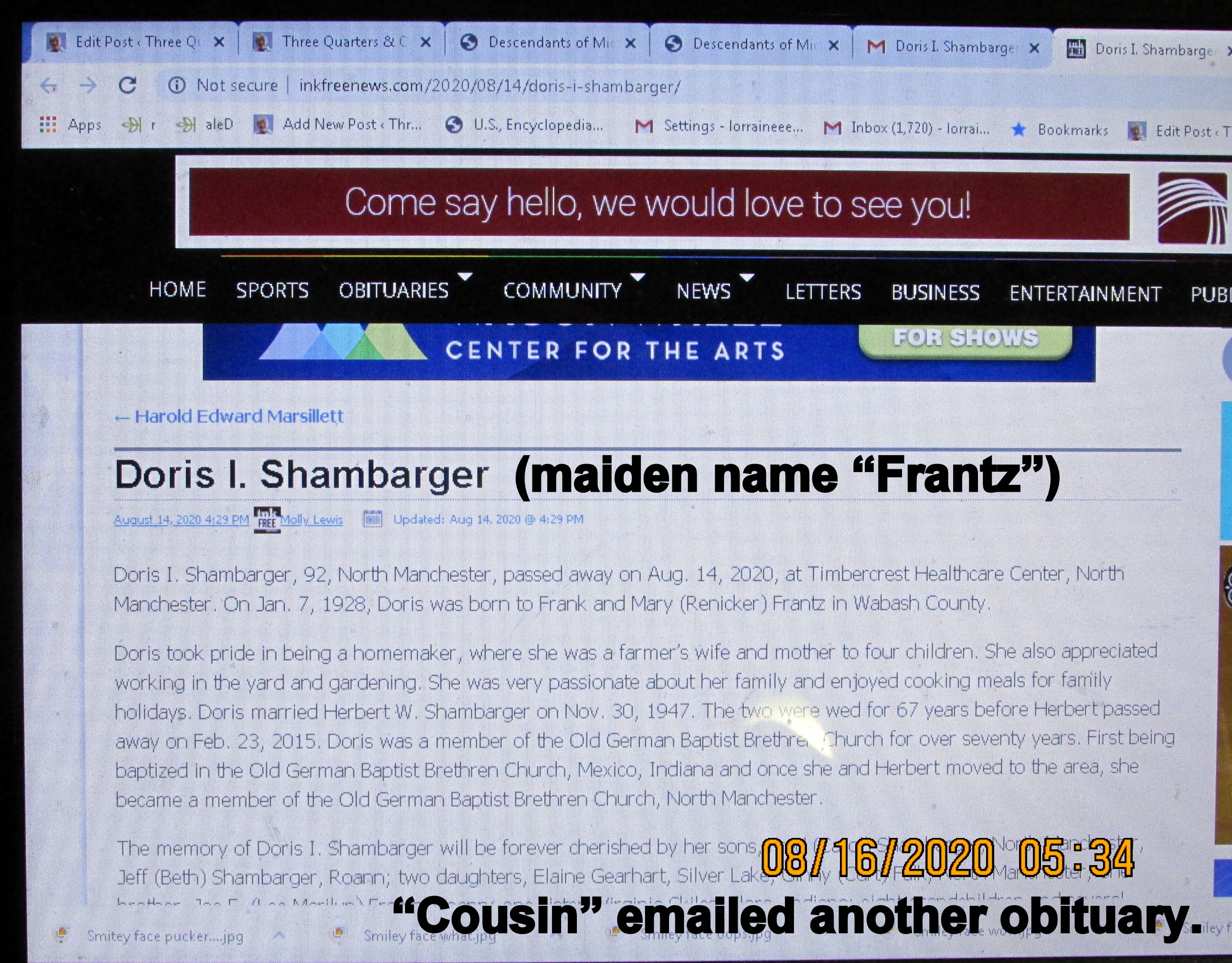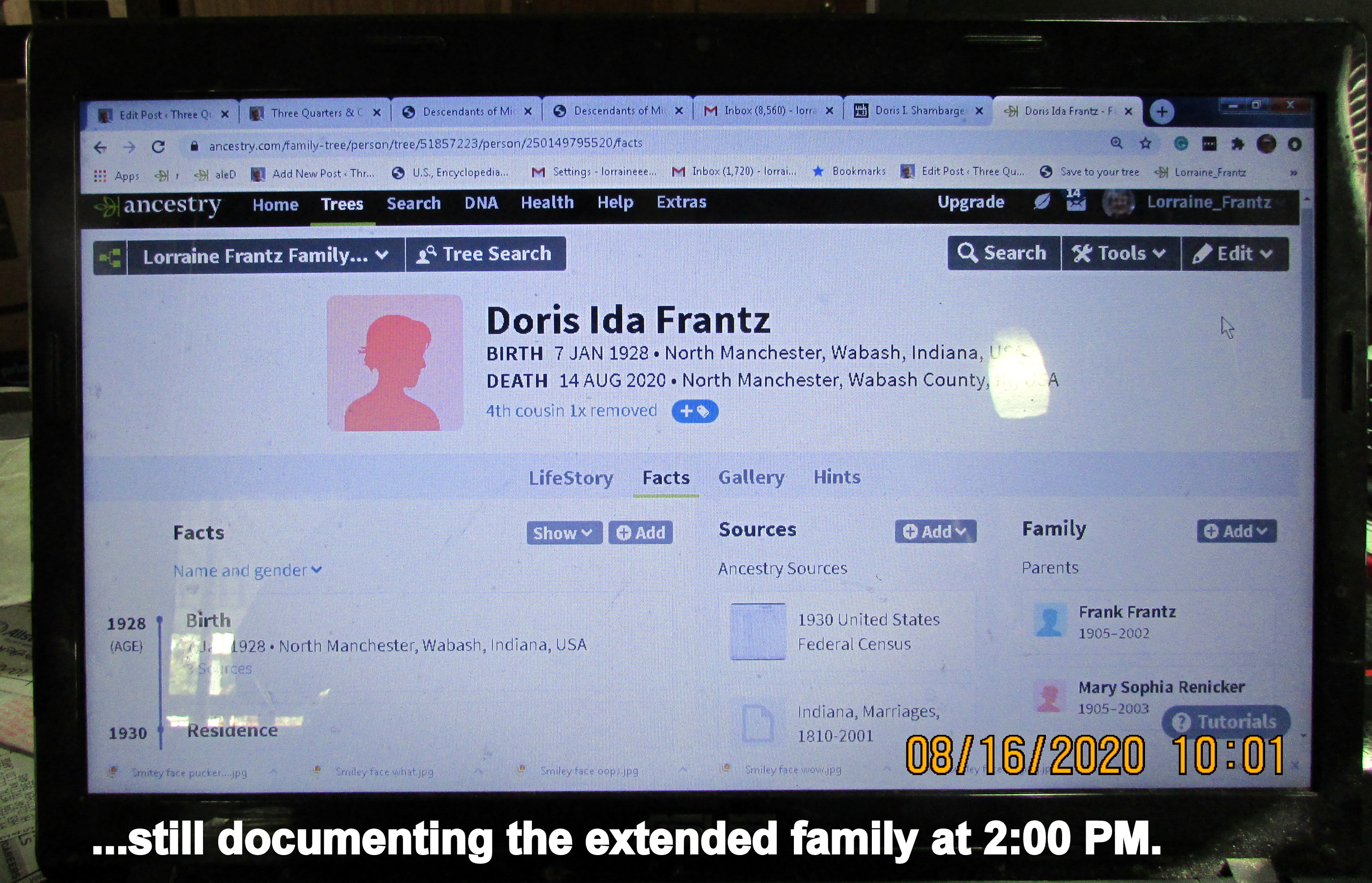 In an earlier blog message, I said I’d abandon Ancestry.com until I received a new WiFi-signal-receiver “gizmo.” When I checked my email messages yesterday morning, another obituary from “cousin.” I don’t know how he gets these obituaries within hours after the death of a family member. I appreciate his faithfulness (for sources) and, in exchange, I add the information to our databases. From 5:30 AM until 2:00 PM, I was documenting information about fourth-cousin-one-time-removed and the collateral lines (more than one-hundred individuals total).
