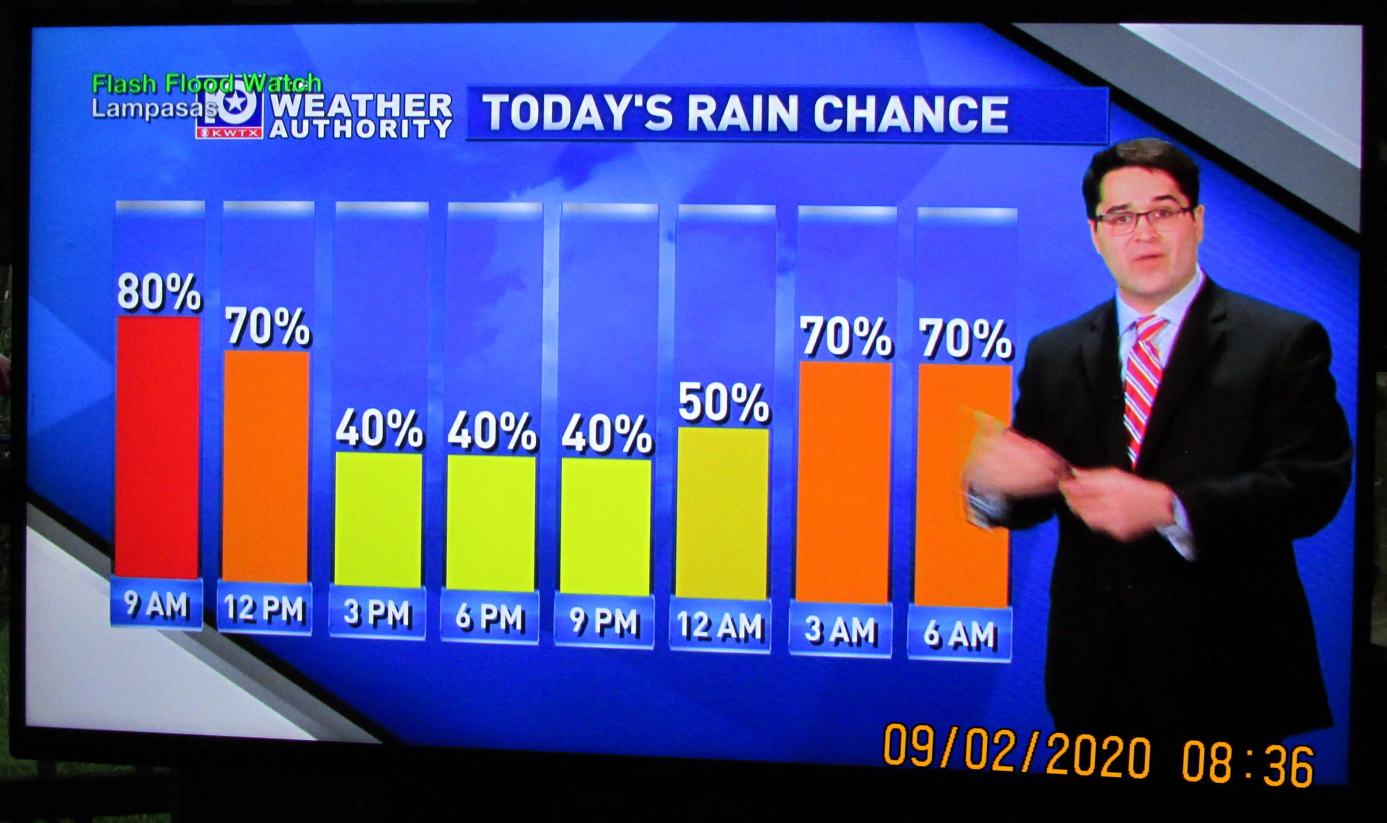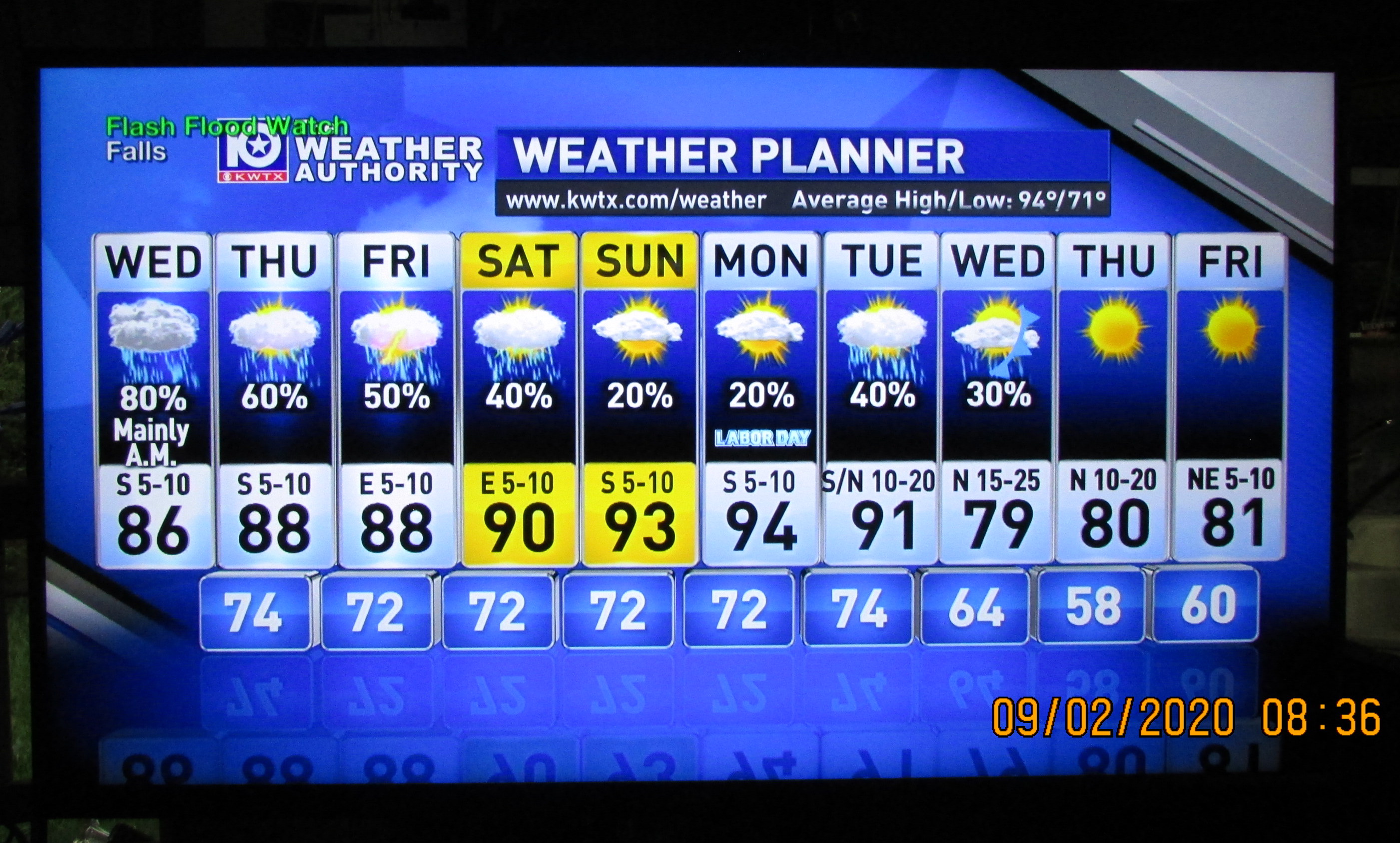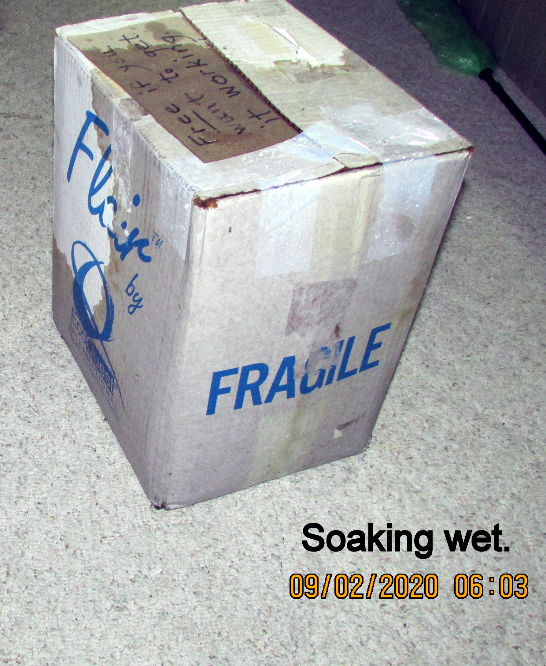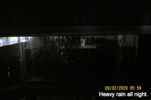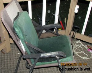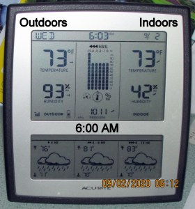 At this moment (6:40 AM) it is still dark as midnight! So strange because usually “light” at this time. An indication of the dense cloud cover. ~~ Two boxes were against the wall of the trailer, four-feet from the outside edge of the porch, but they are soaking wet. When I stepped outside the door, it felt like stepping on a wet sponge. Our weather has been blistering HOT (and my lawn had turned brown) and now we have a downpour (for hours). Gratefully, we won’t have the damage experienced during a hurricane but my heart goes out to the folks who are suffering the aftermath of Hurricane Laura. I’m comfortable, I’m dry, I’m safe from “the elements.”