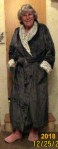 I am so-o-o-o-o cold!! I’m in my pajamas, wearing a winter robe, and socks inside warm slippers. I am reluctant to turn on the heater because I don’t want to be guilty of air-conditioning on one day and heater the next day. (December 2018 picture of Lorraine in Christmas gift winter robe and slippers.)