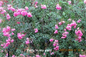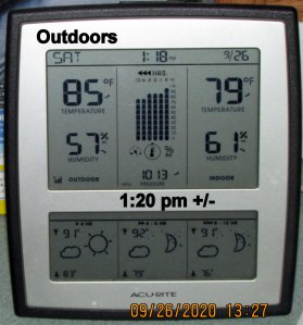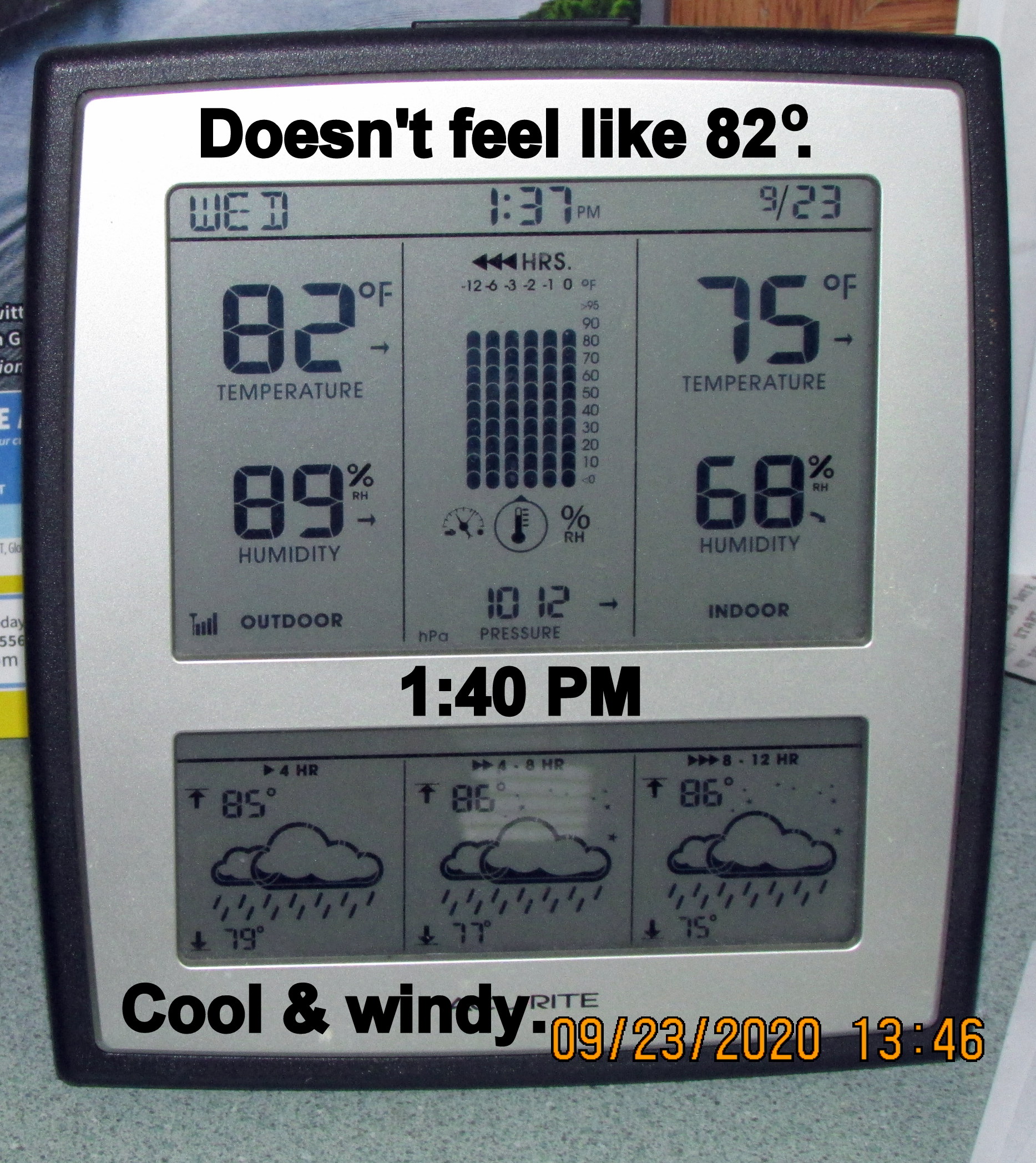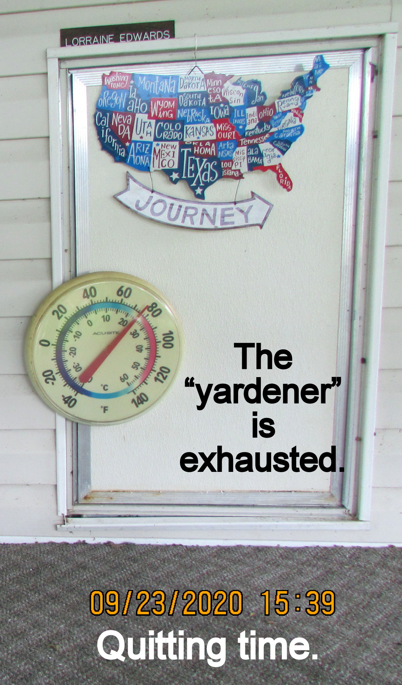 Two Aleve kind of day. My yard is looking much better after several hours attention. Then I took a nap on the lounge chair. ~~ My day started when I dug out sweat pants and a sweater (because it was chilly). Now–at 3:30–I have both air-conditioners cooling my trailer home. ~~ The weather is absolutely perfect!!