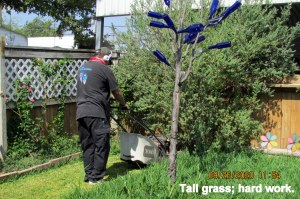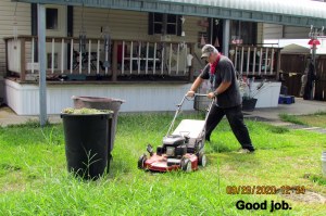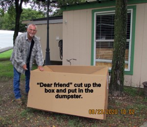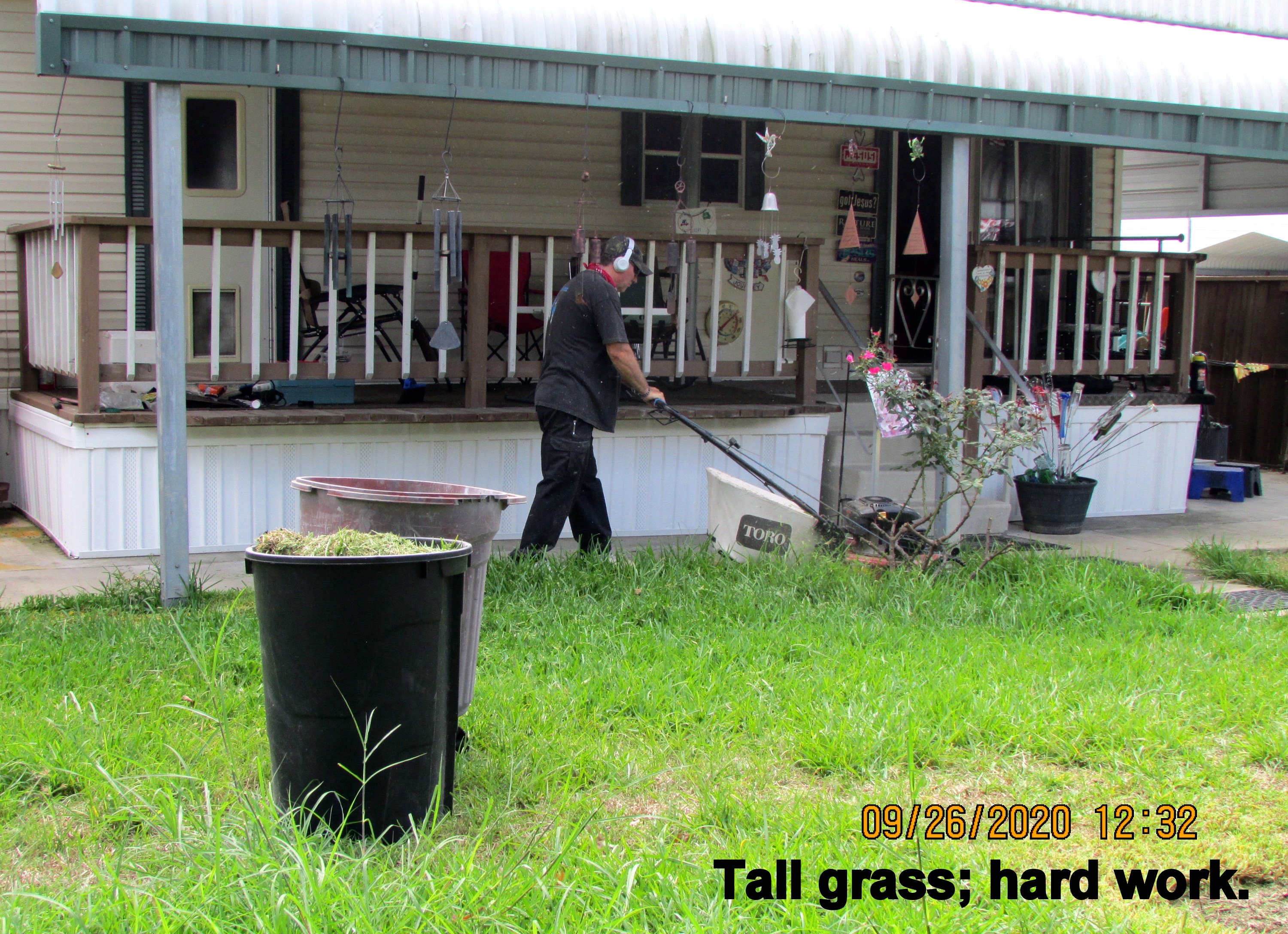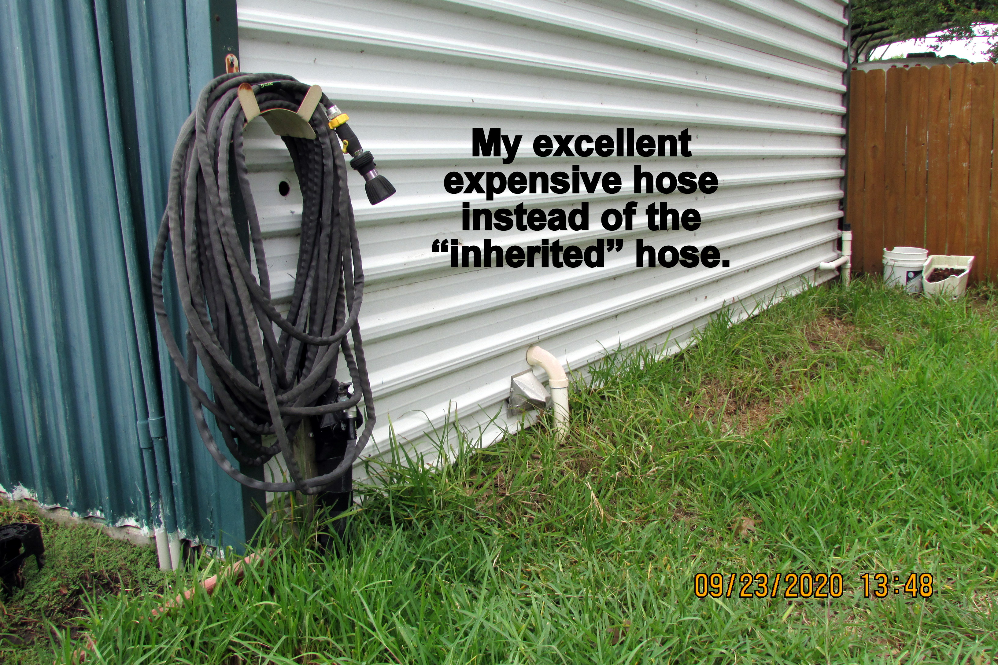 I “hosed” the skirting around the porch and the sidewalk in front of the porch. After a stab at “making the yard beautiful,” I remembered a costly mistake. About one month ago, the grass in the yard was turning brown. For the first time, I set up the sprinkler and watered the grass. Day and night, the sprinkler delivered water to the brown grass. I used 18,000 gallons of water last month!! Mr. Red–owner-manager of the RV Park–came to me concerned that I had a water leak. “No, everything’s fine.” I’m allowed 2,000 gallons per month and the “overage” is terribly, terribly expensive. I haven’t received the bill yet–but several hundred dollars!! How quickly I forgot that I must curtail my water projects.