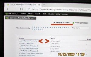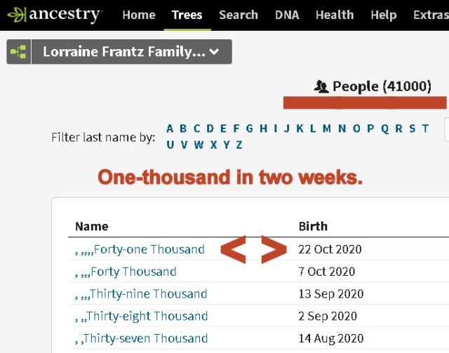 Considering the frustration experienced by your “addicted to genealogy” blogger friend, without access to the Internet, this milestone is anti-climatic. One-thousand in two weeks does not include 313 people in a new tree for a friend.