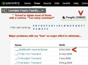 To compound my frustration, my “tree”—on Ancestry—refused to respond to my commands. I contacted Ancestry and a supposedly-knowledgable-person exchanged conversation with me (internet “chat”). She looked at my database and said I had “too many duplicates.” I told her the story that they are not duplicates, they are cousins. Then I reached out to a “tech-savvy” cousin and he scrutinized my database (my tree). One problem: “Ancestry doesn’t like commas.” Today I deleted most of the records that documented the date I reached another one-thousand-individuals in my database. I’ve been able to document an obituary (today) and dozens of “up” and “sideways” family members. I have to “sneak around” to enter the data.
