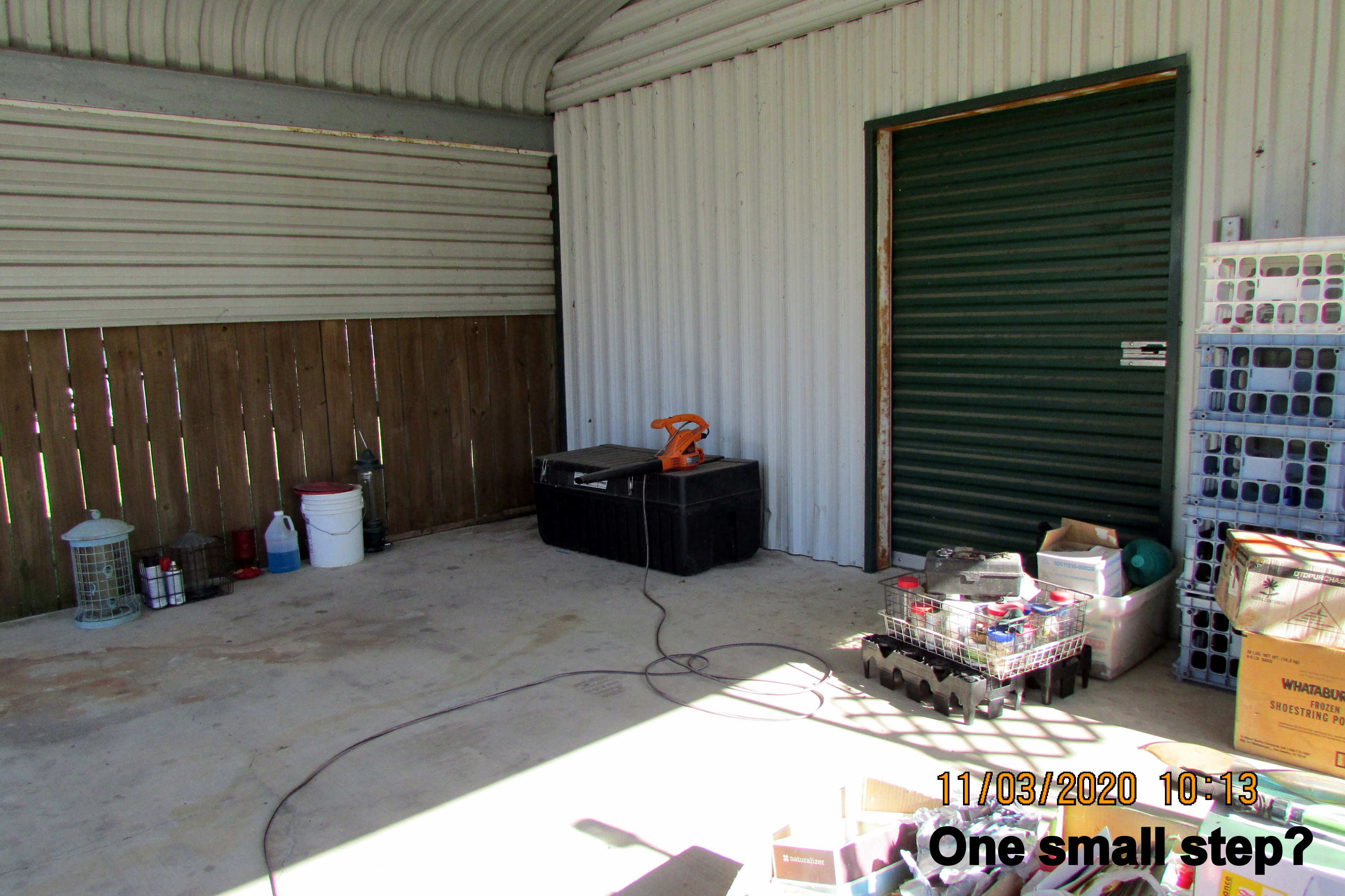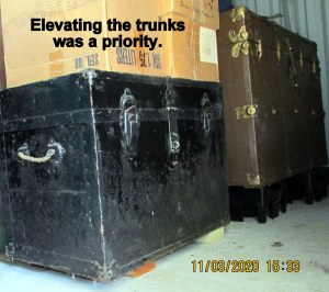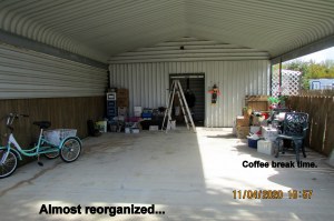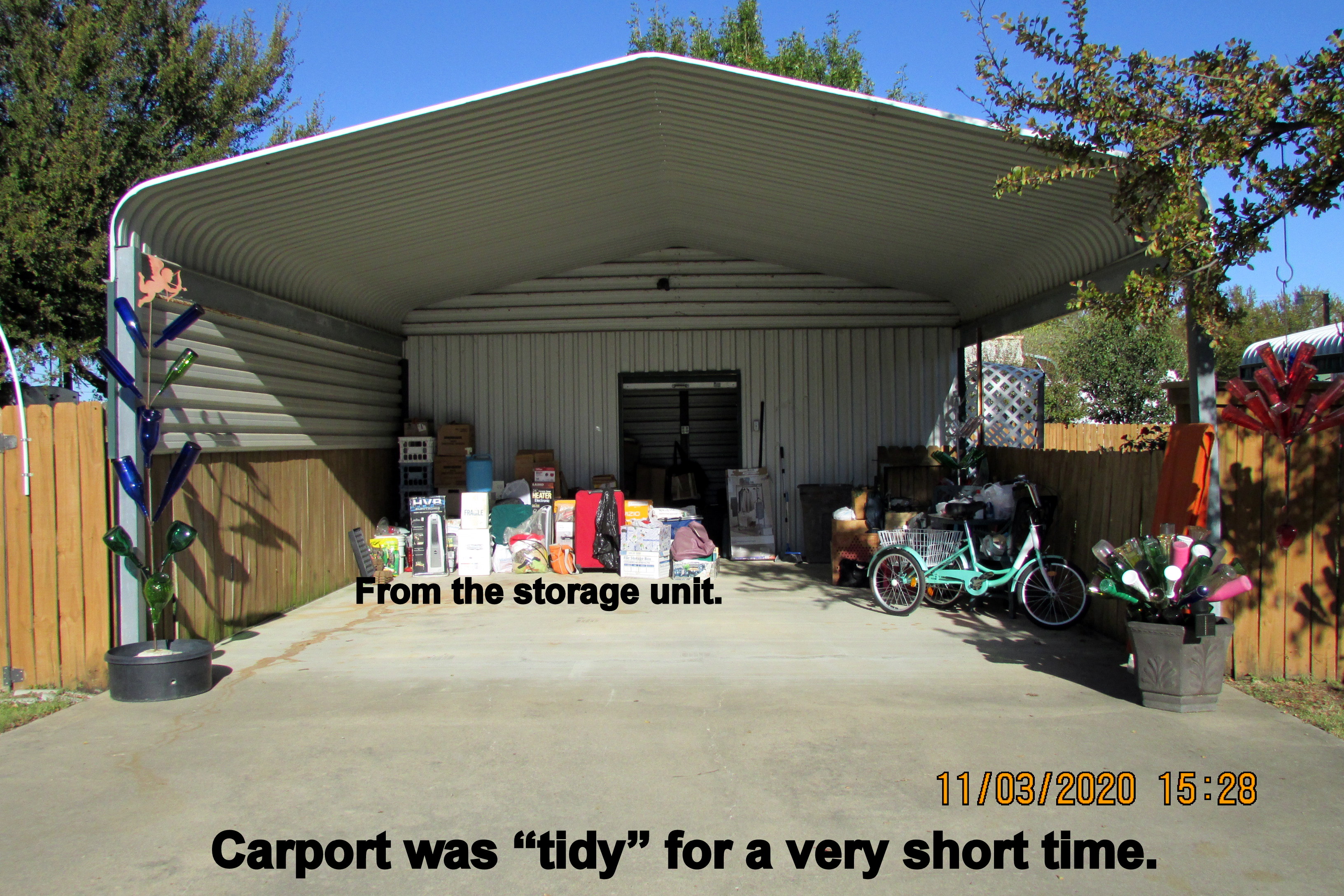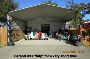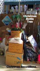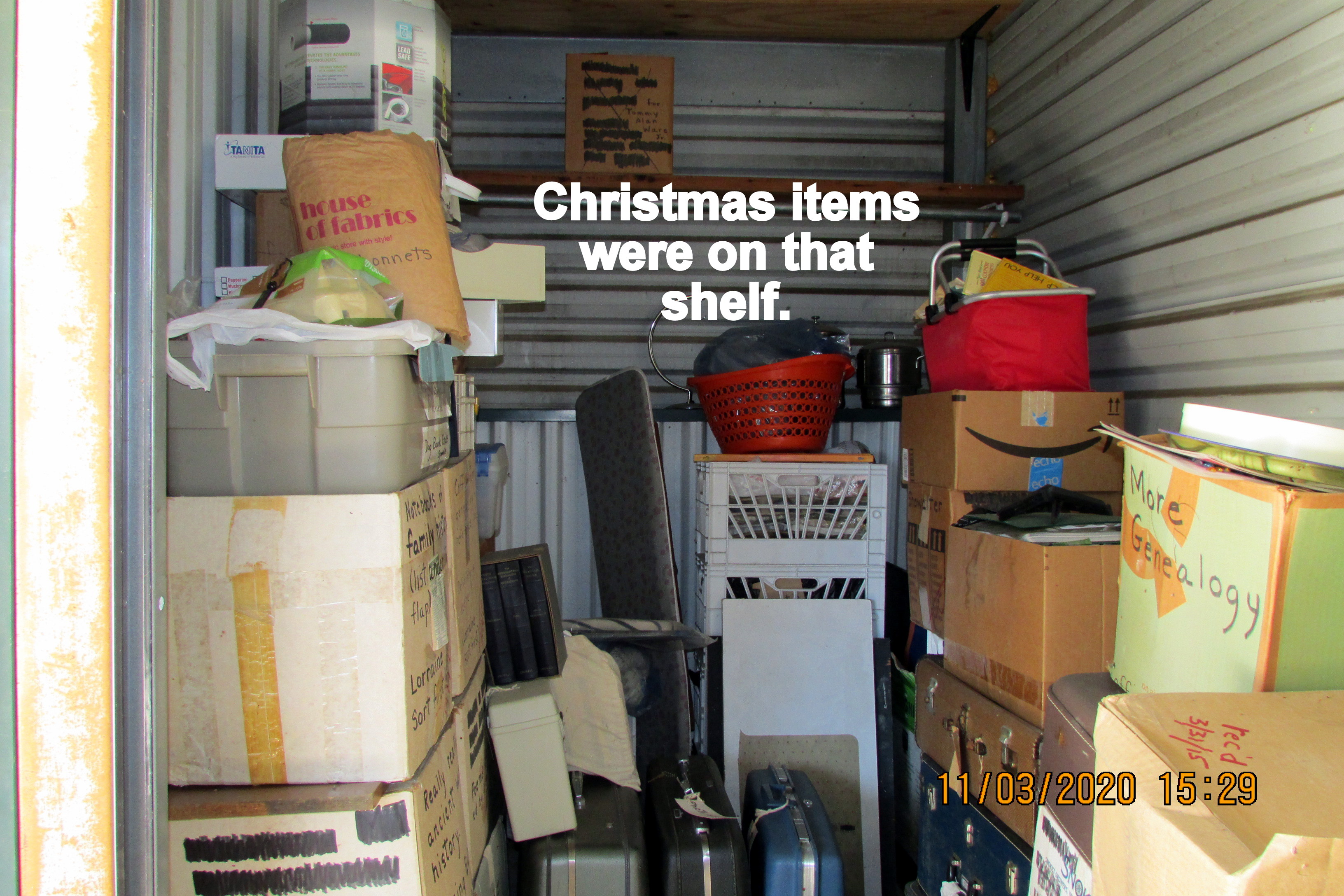 An “angel” appeared at my door–about 2:30–asking if there was anything he could help me with. “Yes, yes, yes!!” We moved a lot of items stacked just inside the door of the storage unit. Strong, healthy “angel” lifted the corner of the trunks so I could slide “risers” underneath. I had worried (for months) that rainwater was flooding the floor and would cause damage, mold and mildew. No evidence of damage (praise the Lord). Then an additional shift of memorabilia so he could reach the Christmas items. (I plan to create my Christmas Bottle Tree soon.)