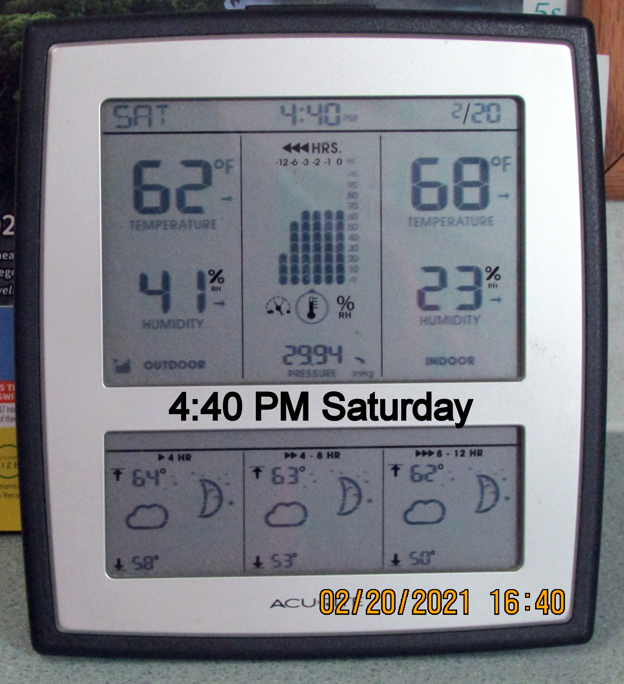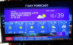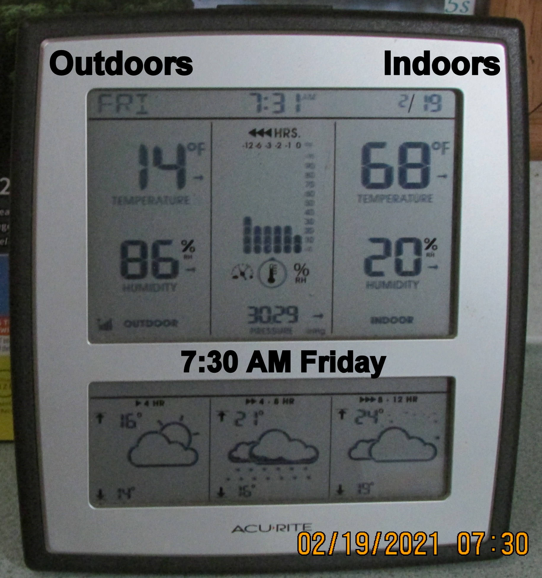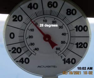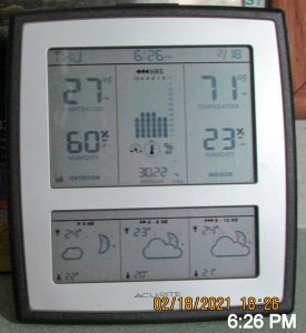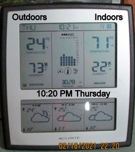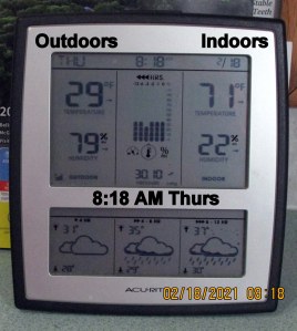 Creature of habit!! I took a picture of the indoor-outdoor thermometer just prior to going to bed. “Up” this morning after a surprisingly good night’s sleep and took a picture of the indoor-outdoor thermometer. Gotta have my coffee! ~~~ Yesterday’s host and hostess are insisting I return today for more of their hospitality–and a shower!! I confess the need to wash away offensive body odor but I’m a “creature of habit” and “don’t want to impose“ and prefer to stay home now that I have electricity and heat.