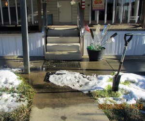 I spent some time—and energy—outdoors. I shoveled snow and ice, and swept the sidewalk. I walked to and from the Clubhouse to fill gallon containers with water for “spit bath” and flush the toilet.