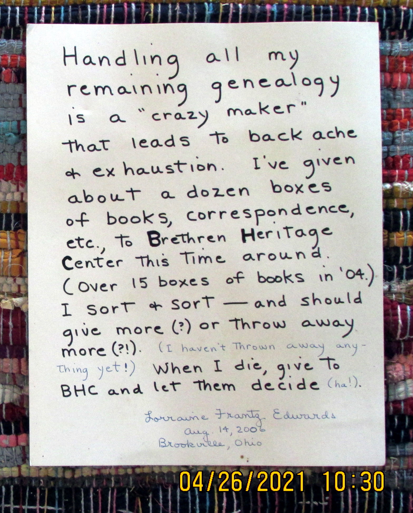 Frankly, I hate to throw things away. I don’t think I’m a hoarder; I just keep things because “I might need it someday.” OR, my recent intention to give away genealogy and household miscellaneous. With a few exceptions, I think a lot of things will end up in the trash.