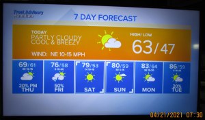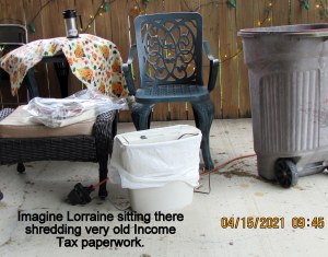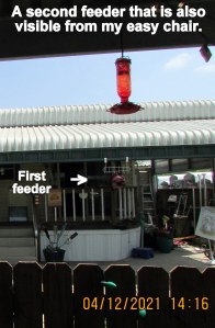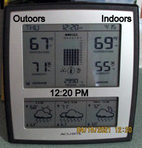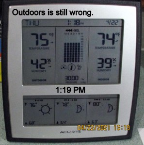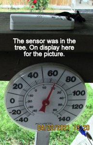“The old lady” works on technical problems, too. Fresh batteries and an alternate setting. Alas, “the old thermometer” hasn’t responded to my resuscitation efforts. (1) New batteries, (2) swapped to a second sensor, (3) worked with settings, (4) pictures of my futile efforts! ~~ “Other activities“: Washed the dishes, washed my hair, took a shower, and prepared Hummingbird nectar.