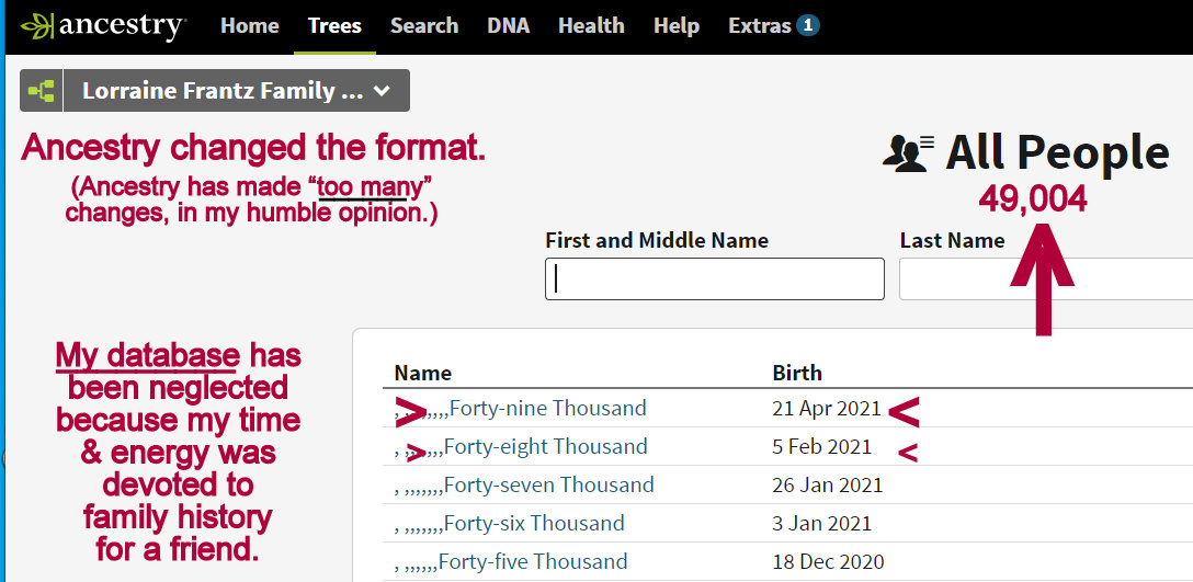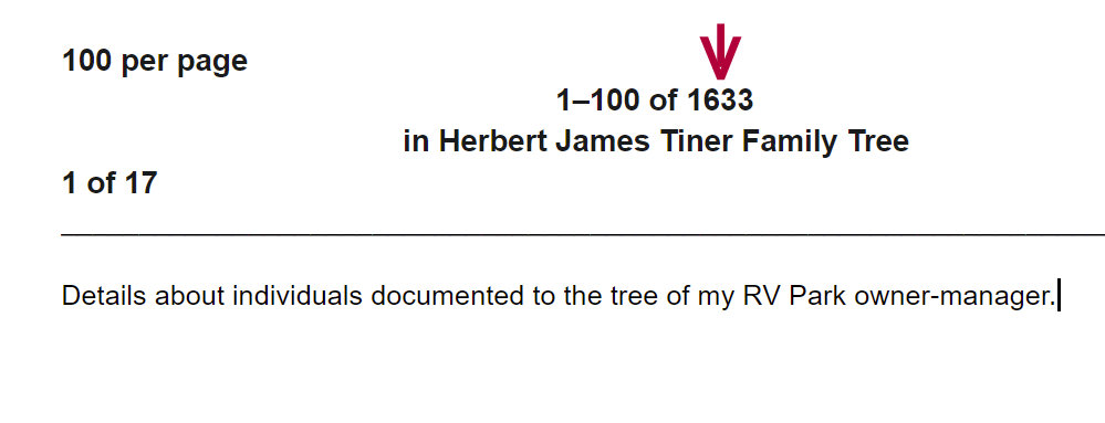 Here is a link to my previous milestone regarding individuals in my Ancestry database. ~~ Documenting “my family”—and collateral lines—is easy because the individuals are well documented. I “hit a brick wall” while documenting the ancestors of my RV Park owner-manager, and his wife. I did exhaustive searches and cannot get past their great-grandparents.