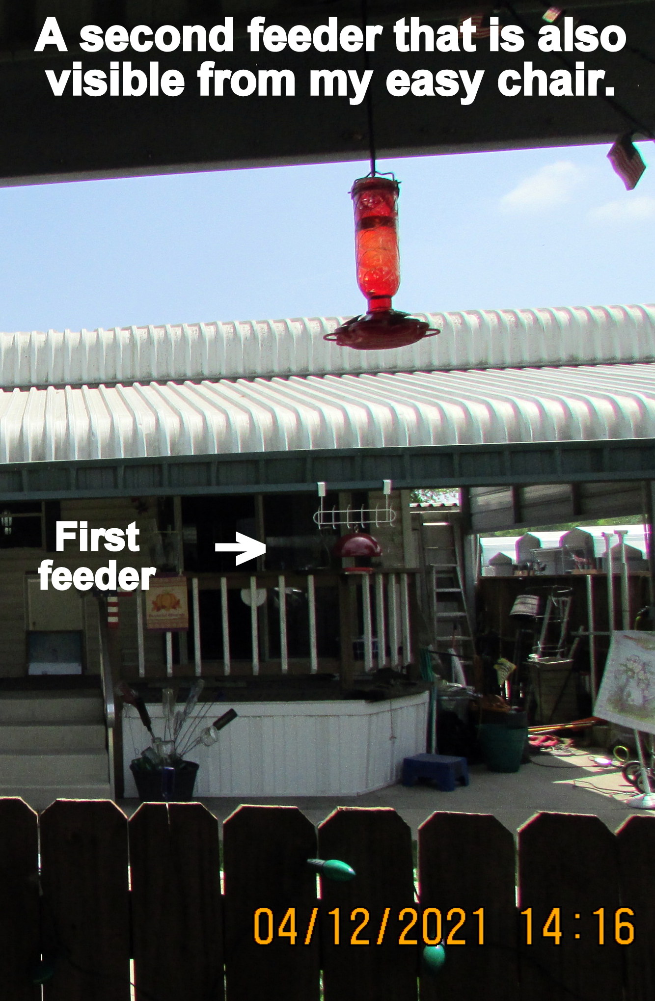 The Hummingbird feeders were empty. I’m in the process of making a double batch of nectar. Since the twelfth, I’ve filled feeders a couple of times!! Perhaps too few flowering plants for Hummingbirds to feed upon? In Livingston, Texas (and North Carolina), I had flowering plants specifically for Hummingbirds, butterflies, and bees. The rose bushes in my yard (Waco) obviously do not provide nectar.
