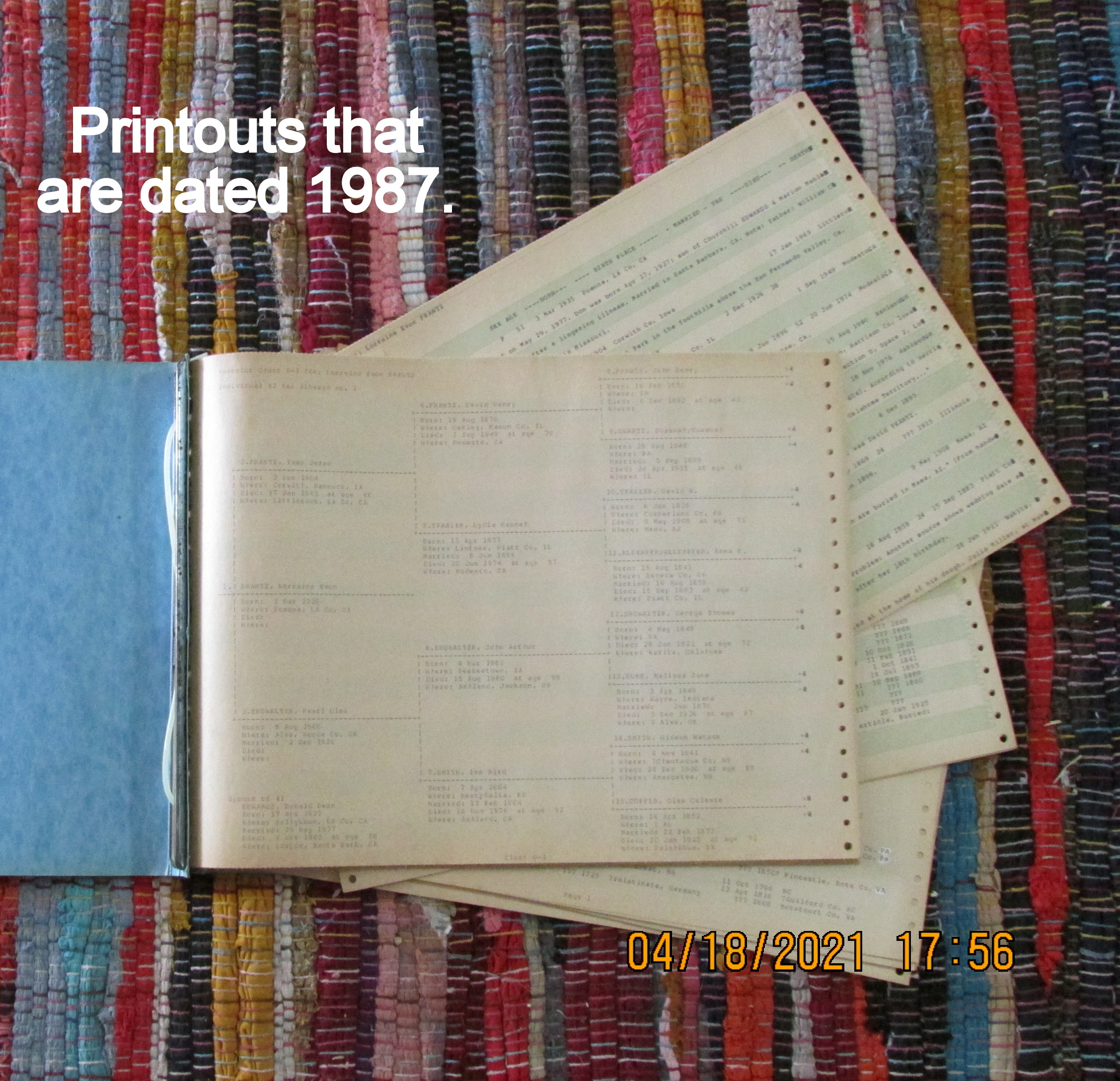 Here is a picture of “family history paperwork” that is more than three decades old. One… is dated 19 February 1987. All will go into the trash bin because it has no value. The information is well-documented in my Ancestry.com database.