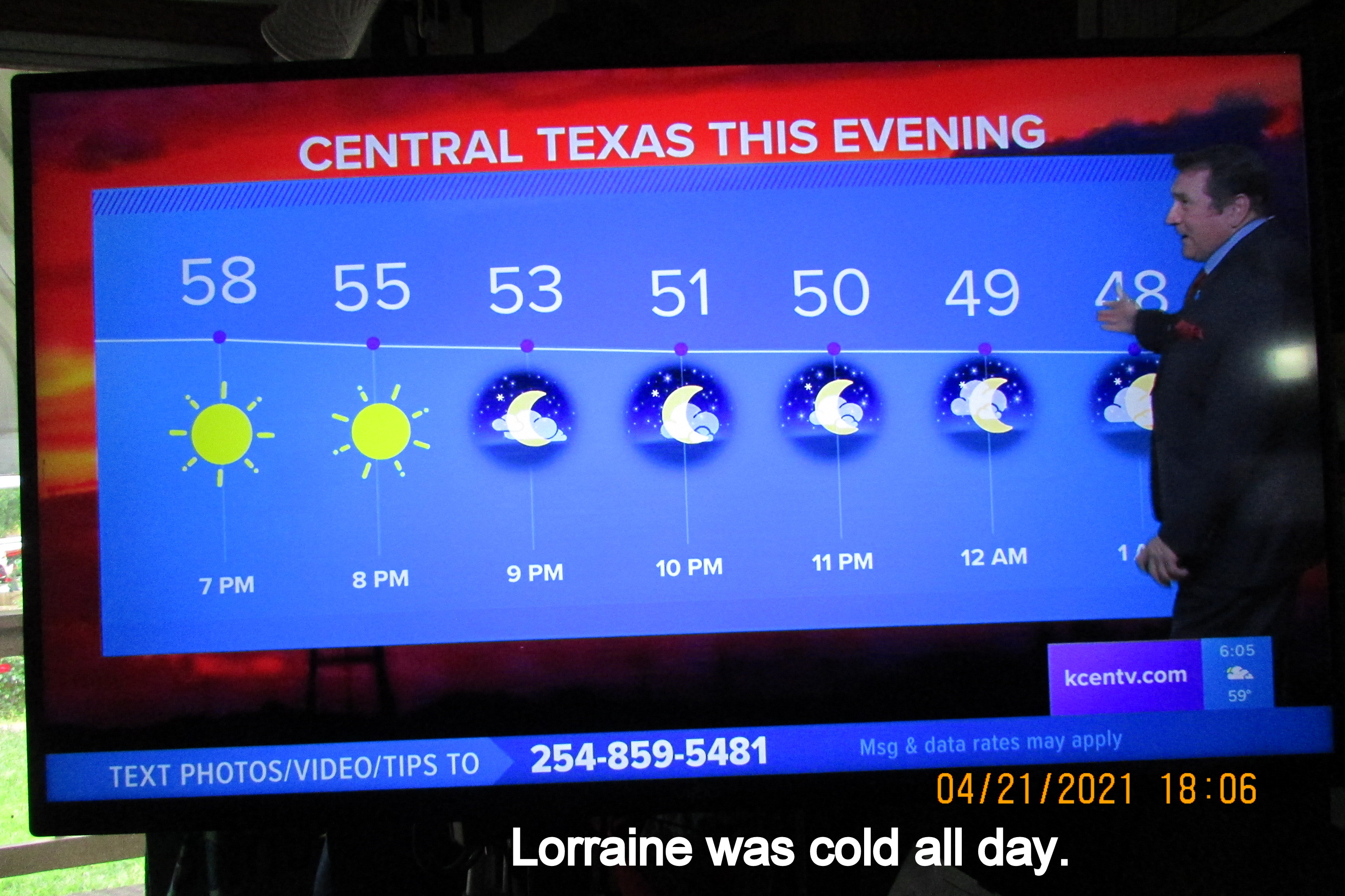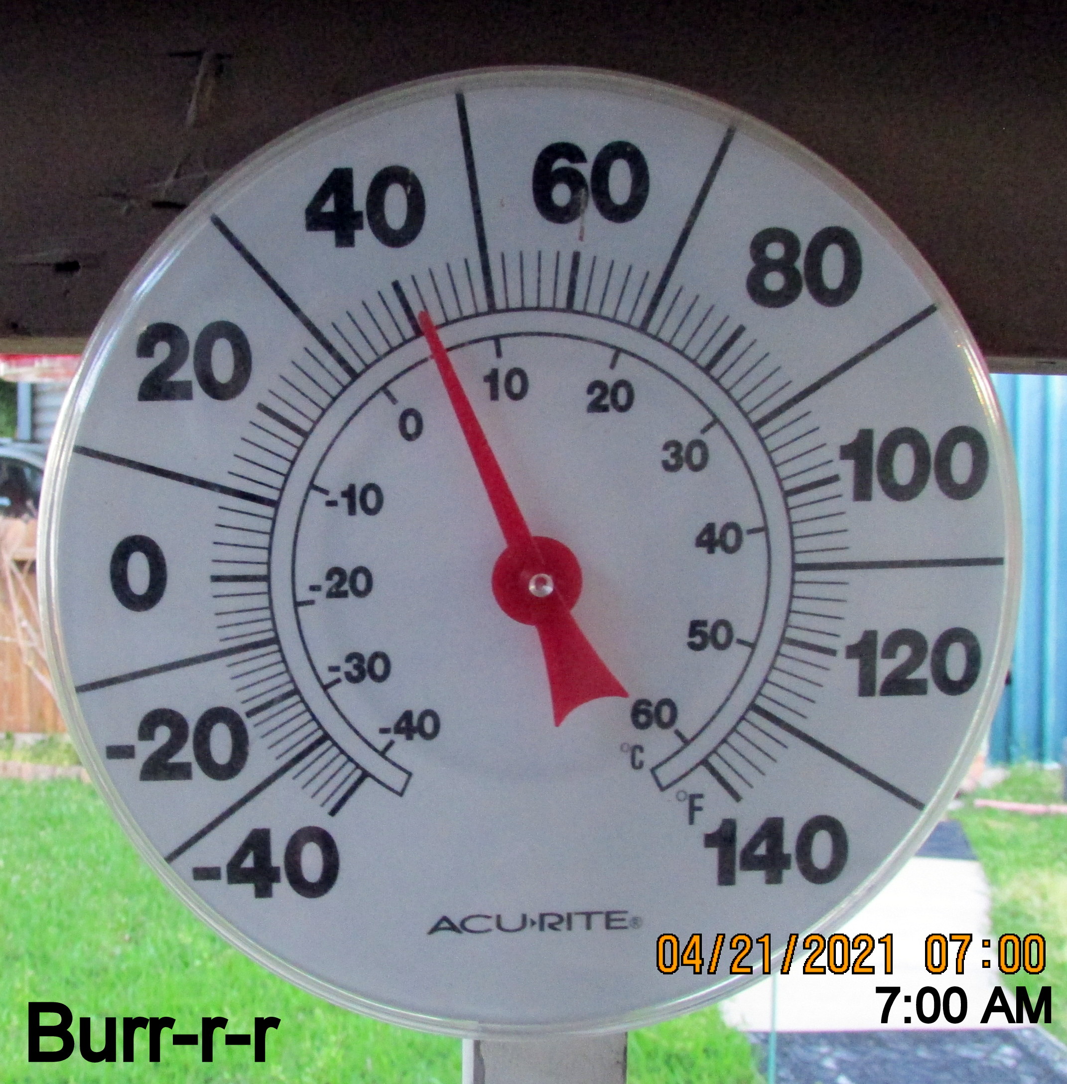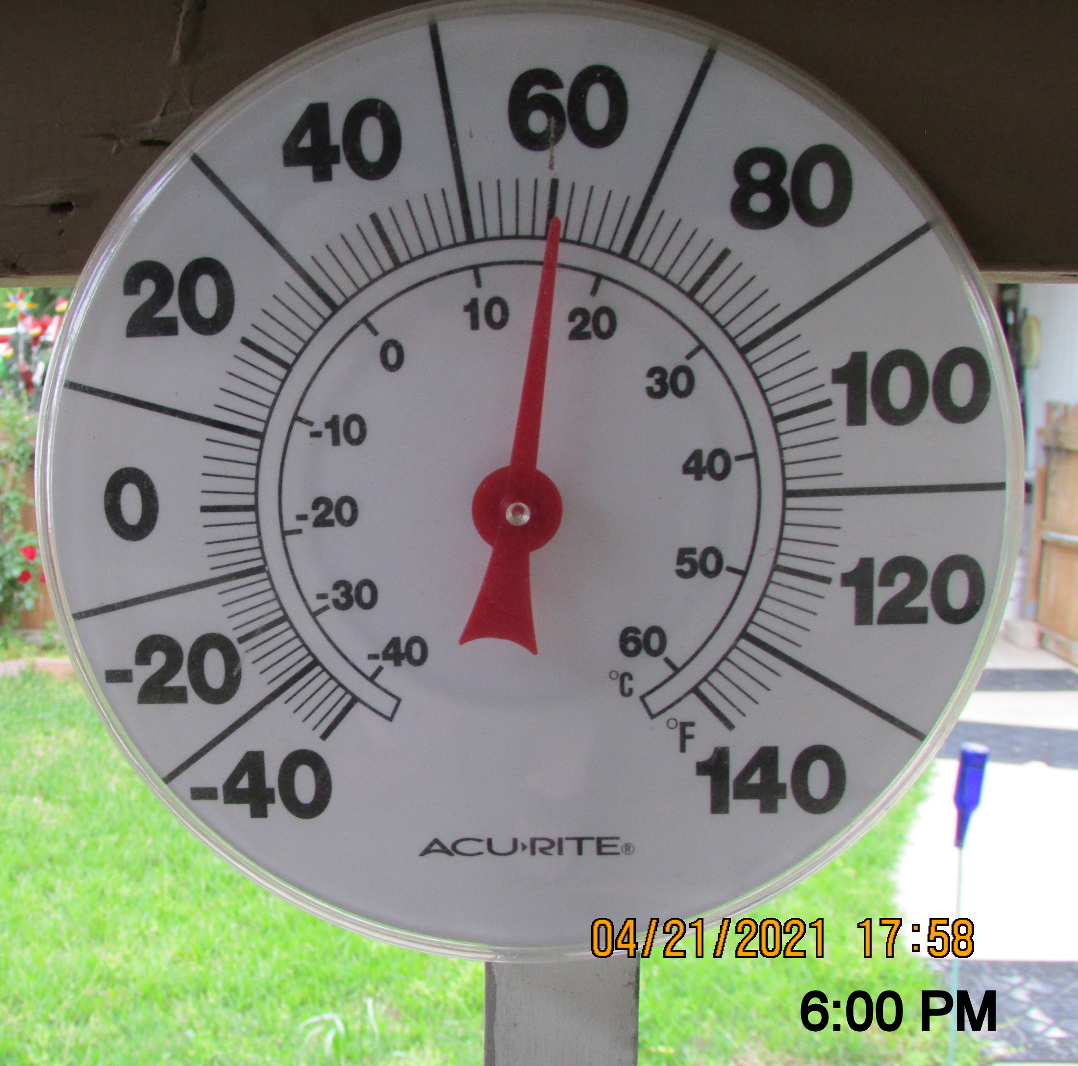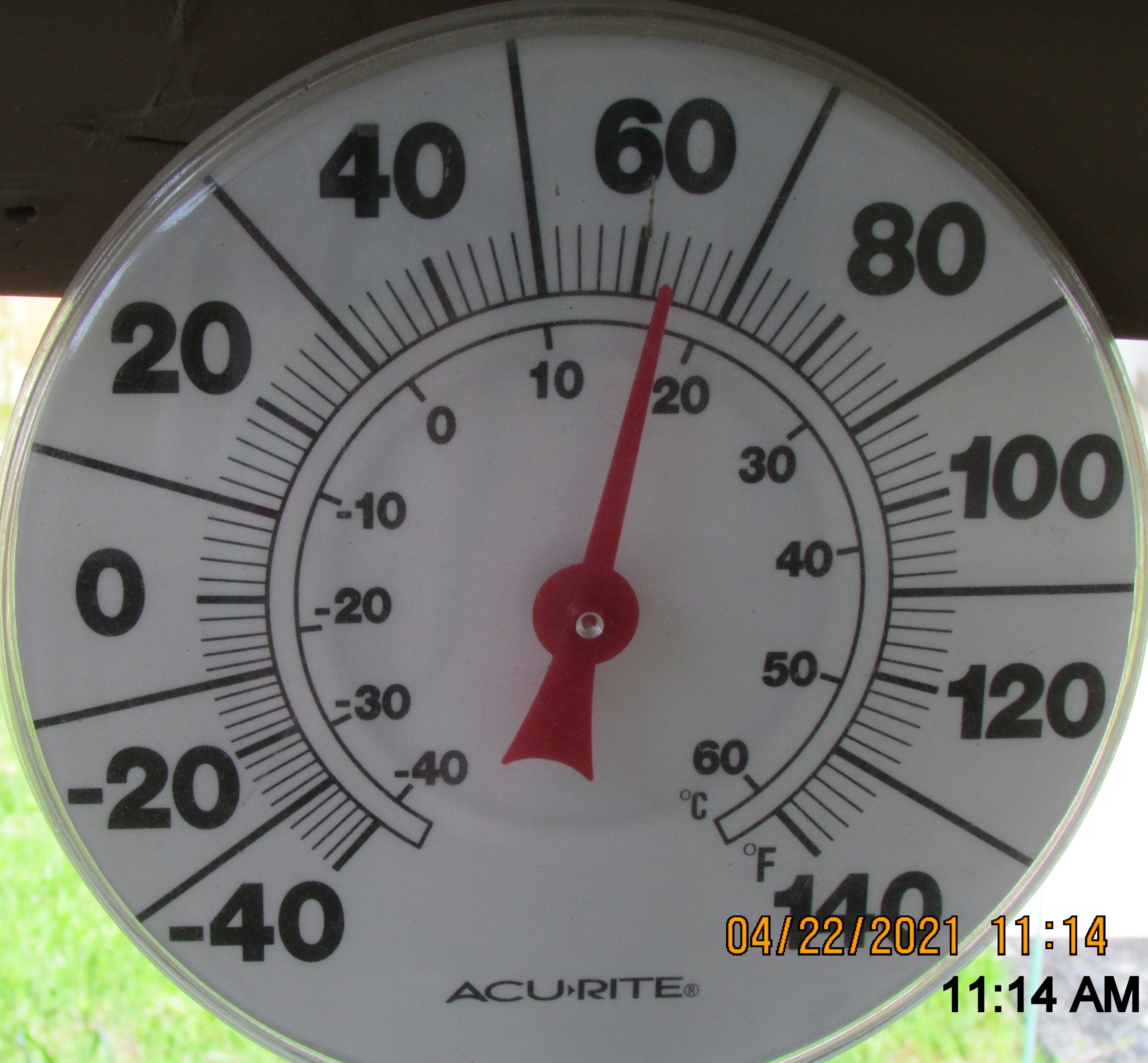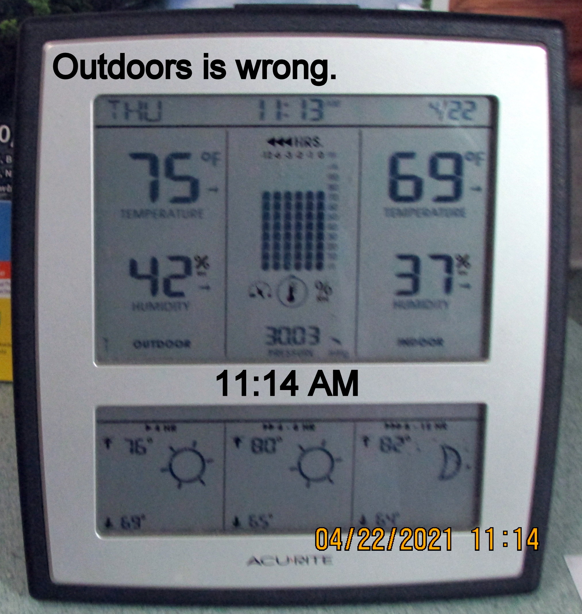“The old lady” works on technical problems, too. Fresh batteries and an alternate setting. Alas, “the old thermometer” hasn’t responded to my resuscitation efforts. (1) New batteries, (2) swapped to a second sensor, (3) worked with settings, (4) pictures of my futile efforts! ~~ “Other activities“: Washed the dishes, washed my hair, took a shower, and prepared Hummingbird nectar.