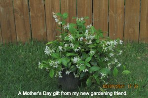 Happy Mother’s Day !! May9 by Lorraine Frantz Edwards . . This really “sweet” gift of Jasmine (vine) will be planted (tomorrow) next to the trellis between the carport and the yard. SINCERE THANKS !! Share this: Click to share on X (Opens in new window) X Click to share on Facebook (Opens in new window) Facebook Like Loading...