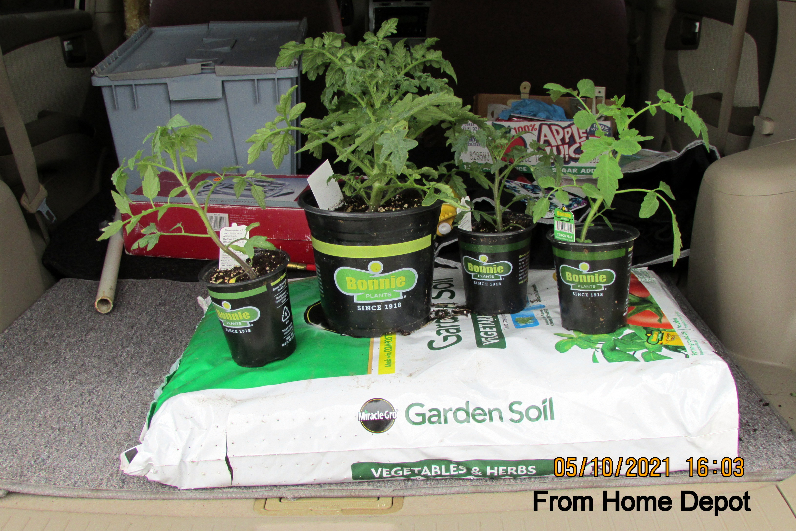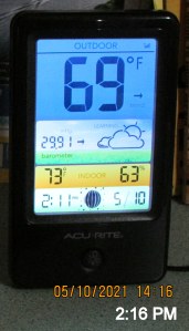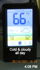Five miles round-trip to Home Depot—all by myself!! I’m getting excited about gardening. I especially want some tomato plants—and I bought four. The day has been surprisingly COLD. Two days ago we were experiencing high heat and humidity. Today my mind was “in the yard” and I did not downsize or accomplish anything indoors. Fresh air and exercise in contrast to sitting at the computer all day. “Fresh air and exercise” while wearing a sweater all day.