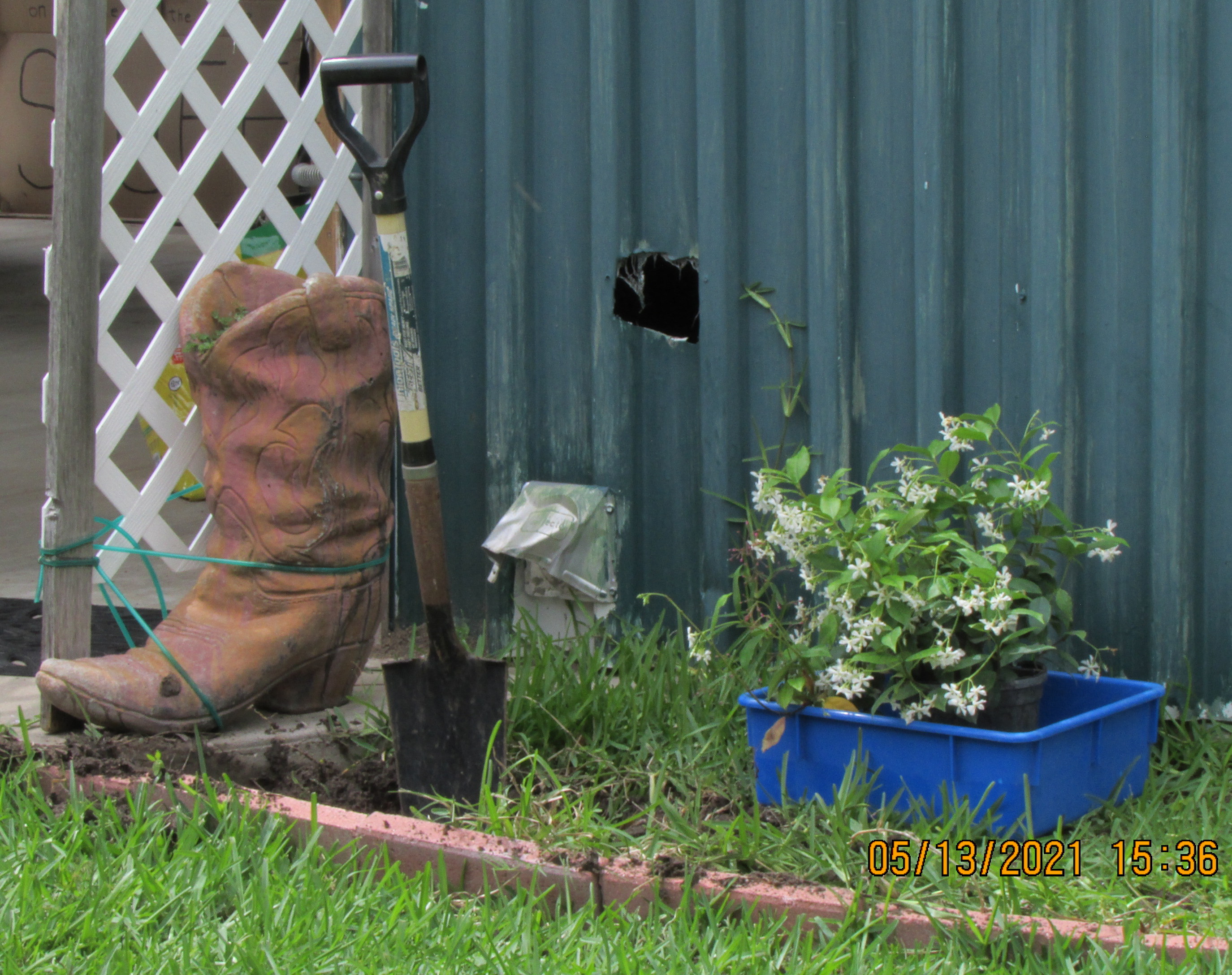 Strenuous exercise. I want to plant the Jasmine and train it to climb the trellis. I handled the soil—without gloves—and was bitten by fire ants. Too soon old, too late smart?! ~~ I’m pleased to report that there wasn’t a lot of damage from the recent rainstorm. Some… but not a lot.