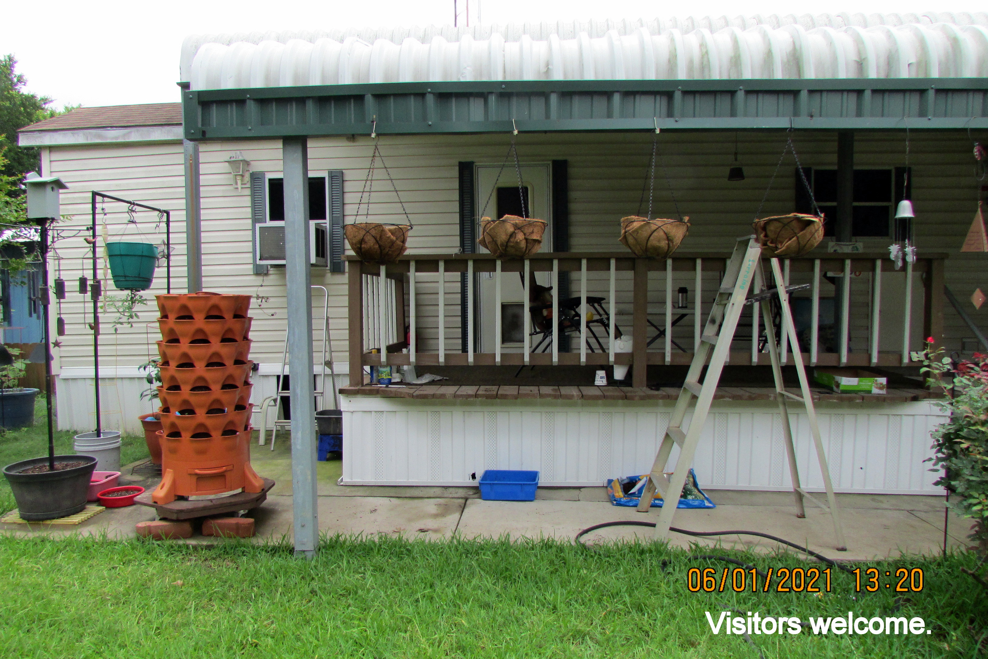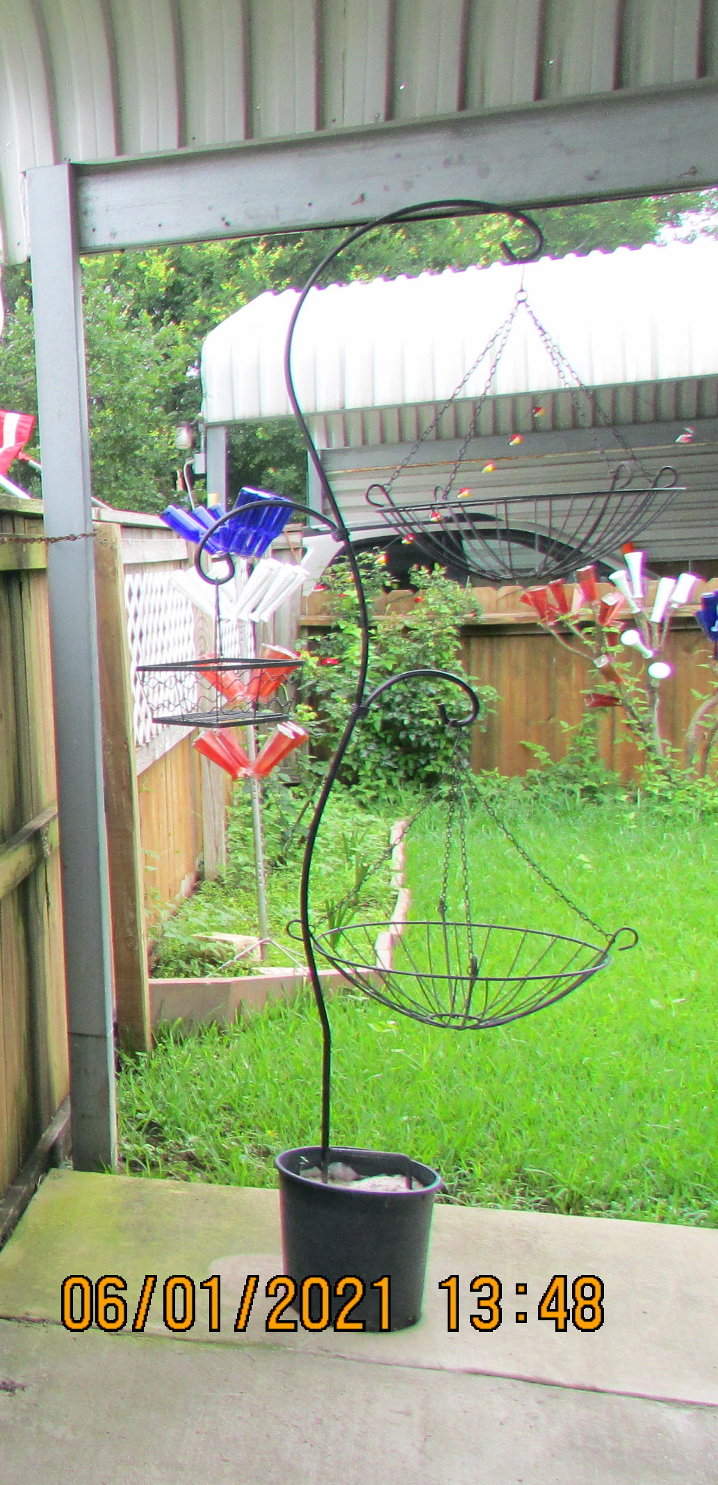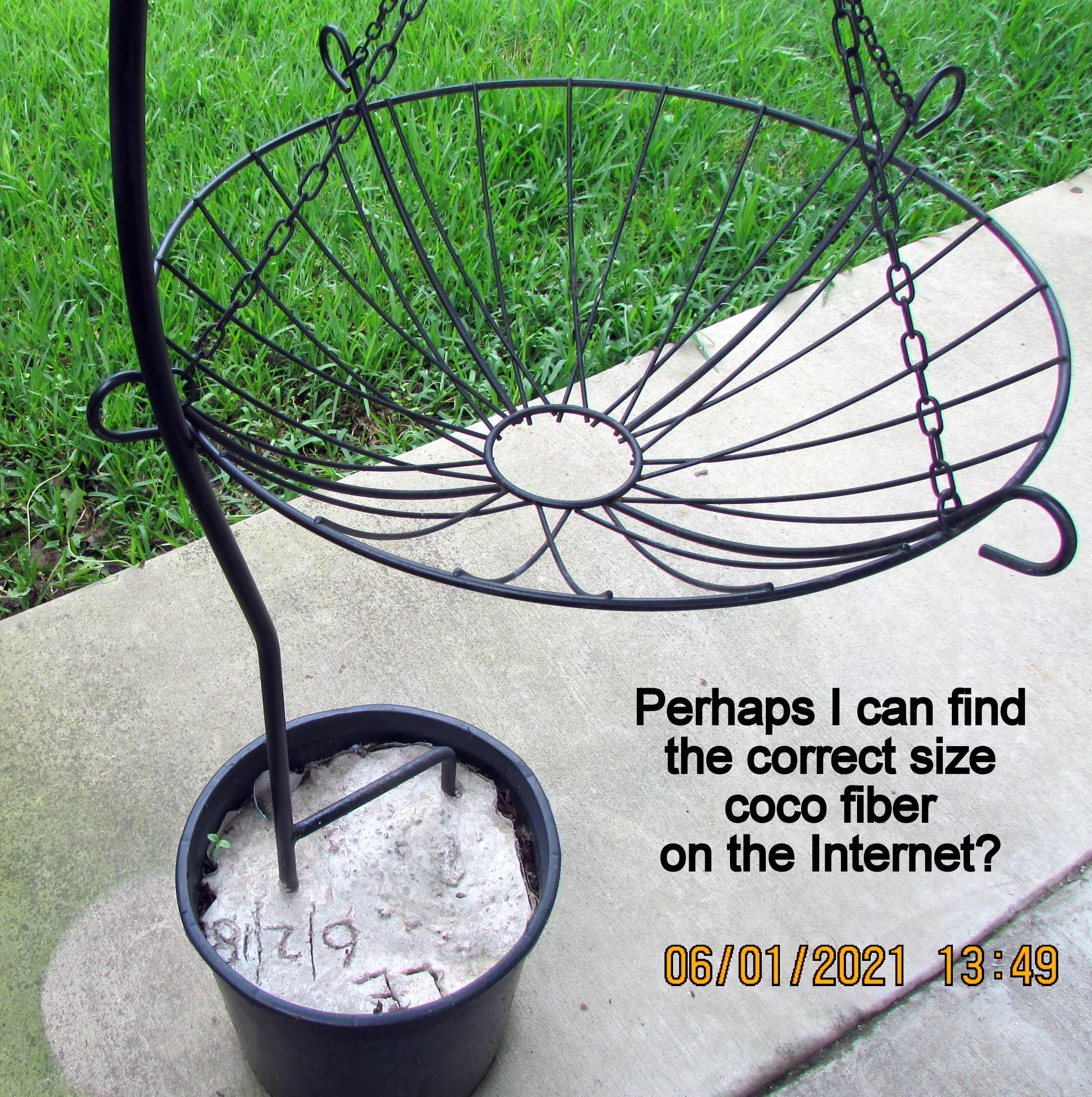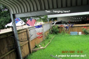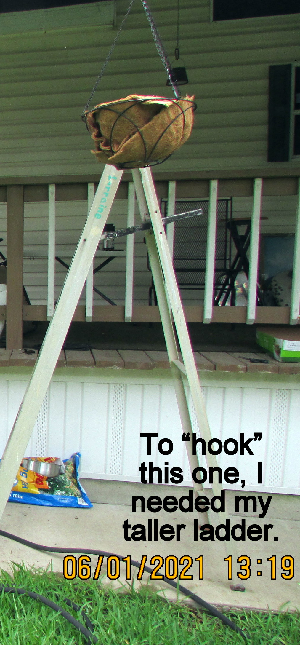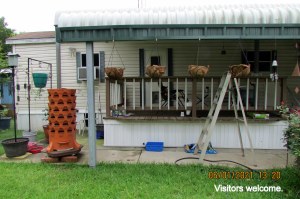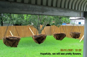 The hard rain destroyed the “starter pots.” Too much water. This time, I scattered the seeds in the planters. “Get my taller ladder.”  I needed an extra step to hang the fourth basket. I’ve been blessed with almost everything I need for my garden. The black wrought-metal baskets were purchased in North Carolina (eight or nine years ago). The hooks (large and small) have been “in my arsenal” for years. I have an abundance of planters and containers. This year, my expense has been for planter soil–and the coco fiber liners. Oh, yes, the expense of four tomato plants and one bell pepper plant.