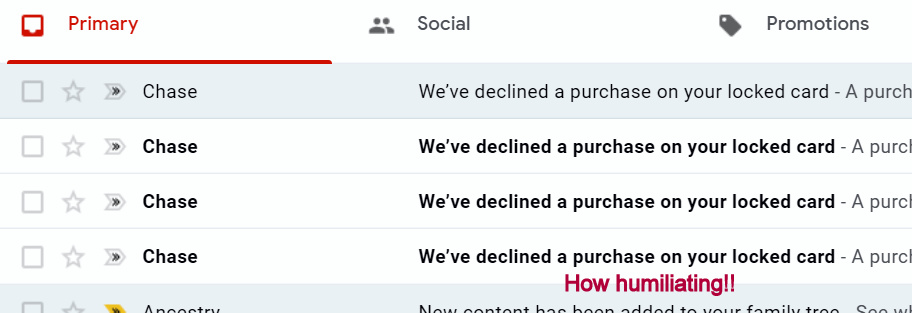 I’m compulsive about gardening now. I needed (wanted) more planter soil so headed for The Home Depot. At the corner where I turn, there is a Dollar Tree. I planned to buy some gardening items because—in the past—always a big variety. None at this store but I bought some brand-name canned vegetables and brand-name soup. (Soup is so expensive at the market; have you noticed?) At the register, my credit card was rejected. I was so embarrassed!! Fortunately, I had a “never-used” debit card in my wallet (with my Waco bank). ~~I contacted my credit card company last week because I was concerned about email messages indicating my Norton-360 had been renewed (almost $600.00). I don’t have Norton-360. I had requested that my card be “unlocked” but, obviously, my request was ignored.