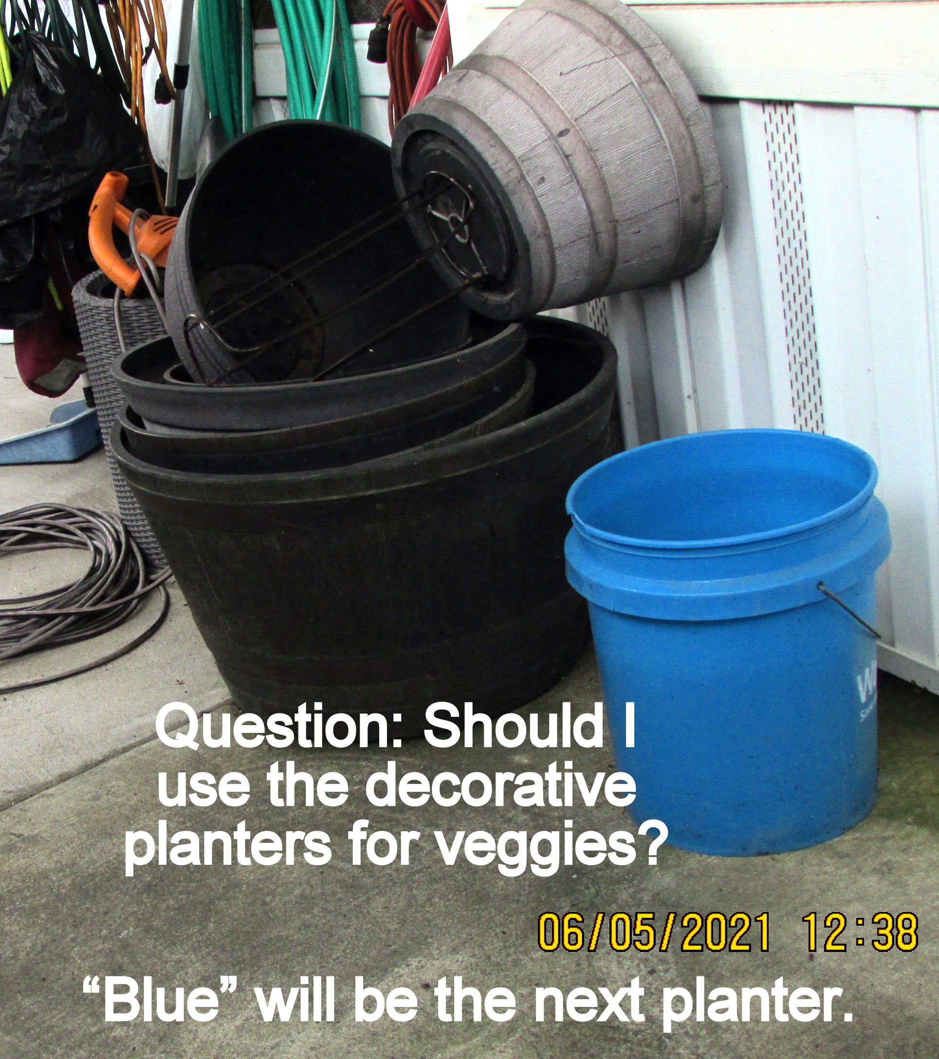 When it gets too hot and humid, this old lady comes back indoors and turns on the air-conditioner. Time for lunch, and time to relax with my blog. I’ve used all my miscellaneous containers and question whether I want to put veggies in the simulated whiskey barrel planters.