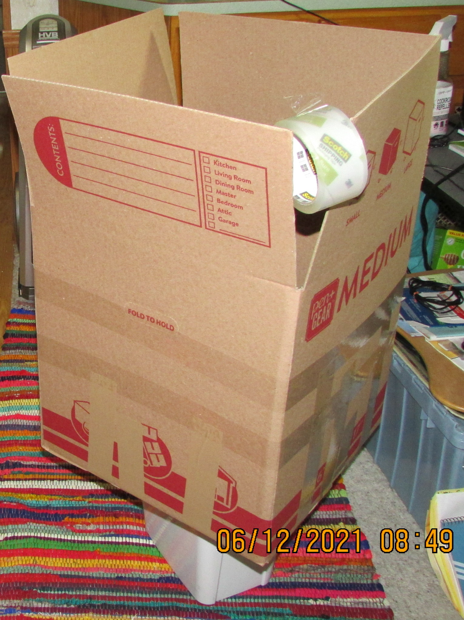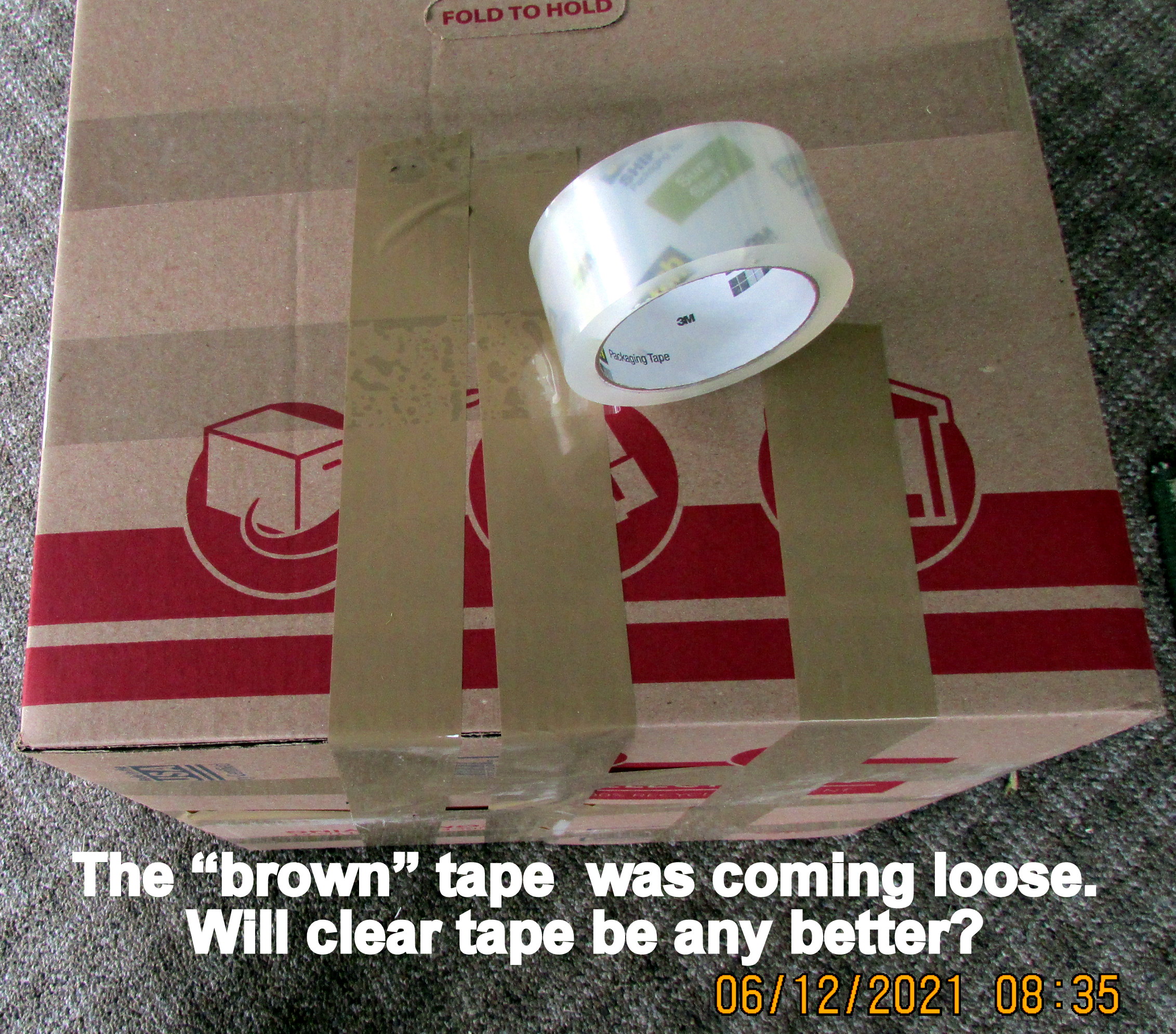 Some of yesterday’s time and energy was obviously wasted because “brown let me down.” This morning, the brown tape was coming loose on both boxes. Now I’ve reinforced the brown with clear tape. False advertising because the brown is sold as “packing tape.”