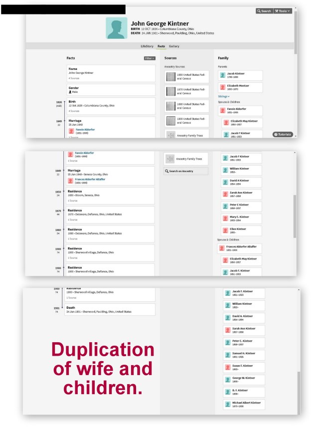 Fighting windmills?! Below is an illustration of a “challenge” I find almost every day. Yes, I covered the name of the culprit. There’s a feature in Ancestry where I can compare my file (my individual) against that of other members. I shook my head in disbelief because “the culprit” didn’t see the duplication of information. ~~ Personally, I’m a novice when it comes to creating a collage. To capture the entire image, I had to “screen capture” three times. So I, too, have the duplication of Jacob. ~~ I wrote a polite note to “the culprit”–one of many “polite notes” I send to folks with an obvious problem. ~~ In this case, this is the husband of my great-grandaunt so, for my part, I’m fighting for 200% accuracy!!