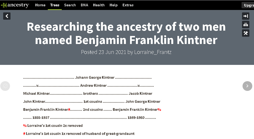 It was important (to me) to accurately document the two men. It took all day. Decisions, decisions!! I started the chart with larger print size (the preference for this old lady with failing eyesight). I reduced the print size because I don’t want a crazy-looking image for future readers (weird wrap-arounds). ~~ This is the third or fourth day documenting the family of my great-grandaunt Frances “Fanny” Alderfer (1831-1906). FYI: One hundred seventy-four individuals added to my database in two days. Frequently, it requires documentation of many individuals before I have the essential information. Furthermore, 174 individuals may have required more than five hundred “sources.” ~~~~ Explanation: Earlier, I thought it was clever to identify myself as “Donna Quixote” because I’m at odds with many other Ancestry subscribers (I’m fighting windmills). After reading details about DonQuixote, I retract the comparison. OK? ~~~~