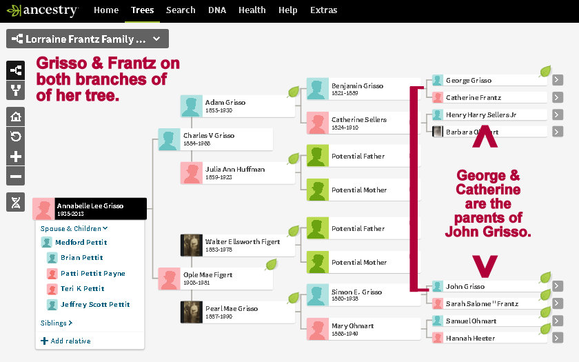 It is important (to me) to document the intertwined families. Annabelle Grisso is my 5th cousin, Catherine Frantz (married to George Grisso) is my 1st cousin 5x removed, and Sarah Saloma Frantz (married to John Grisso) is my 3rd great-grandaunt.