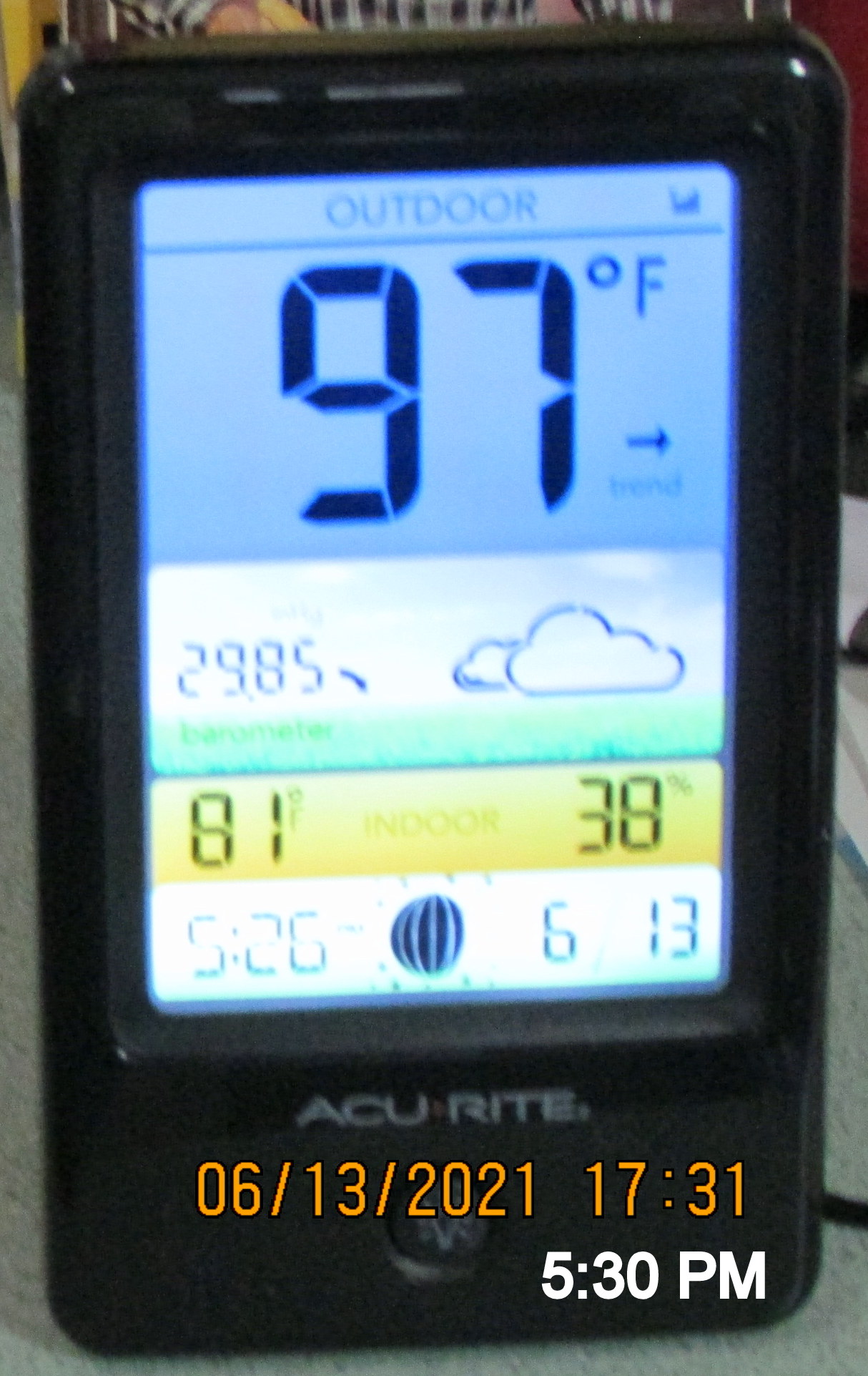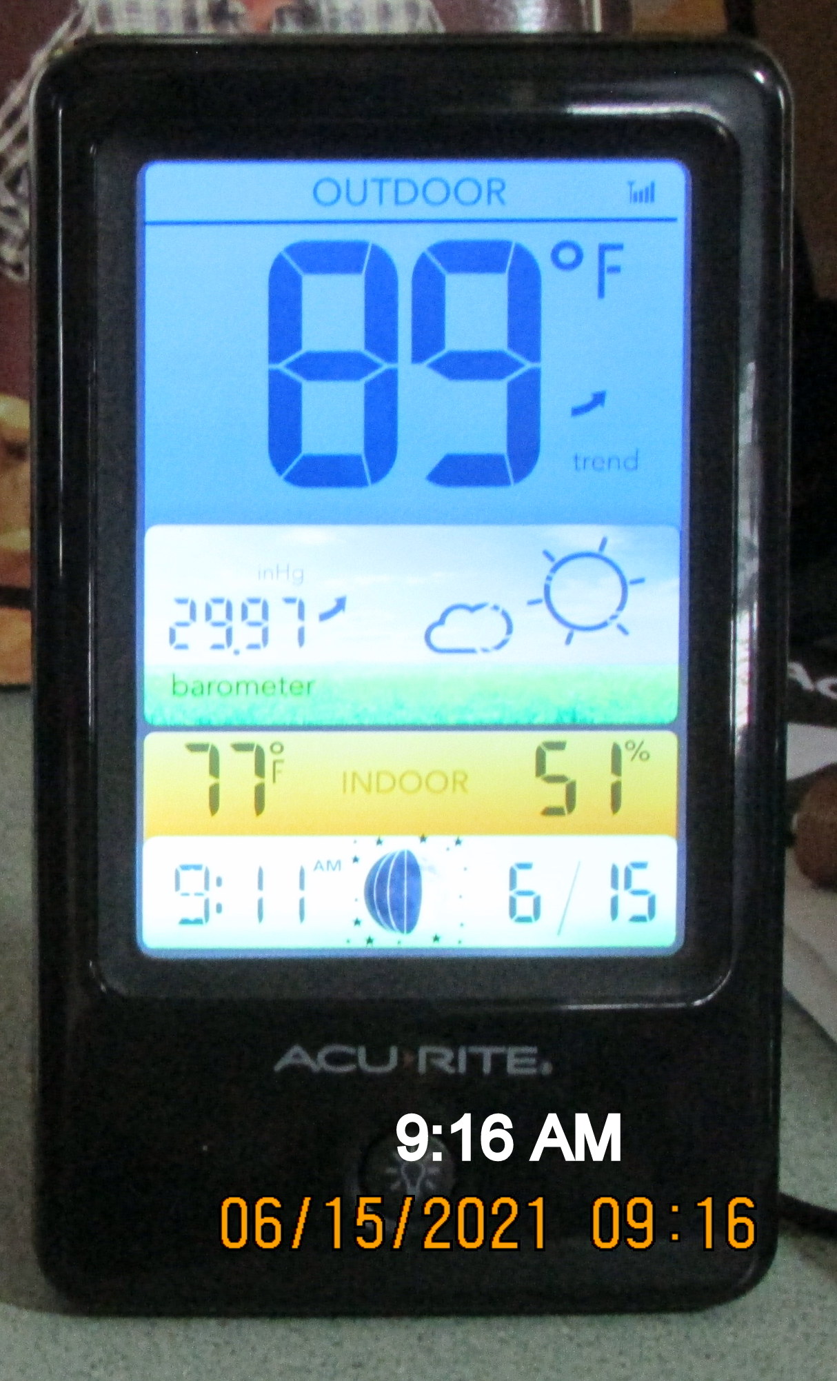 The Texas power grid is overloaded and we are asked to “conserve energy.” It isn’t even 9:30 in the morning and the heat and humidity forced me to turn on both air-conditioners. I did spend a few minutes in the yard watering the plants. ~~ “Deliberate disobedience,” furthermore, because I’ll spend the day sitting at the computer when “too much sitting” isn’t good for Lorraine’s “power grid.”