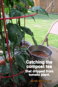 “Compost tea” is liquid gold. It collects in the bottom of the Garden Tower and has the nutrients from organic soil, decomposing vegetable scraps, and earthworm poop. I climb the ladder and pour the “tea” into the upside-down Topsy-Turvy tomato planter. Some… runs through… and I collect in the pan. I can’t have the Bell Pepper plant directly under the tomato plant because each one needs its own space. ~~ “Obsessive-compulsive”; I can’t stop.