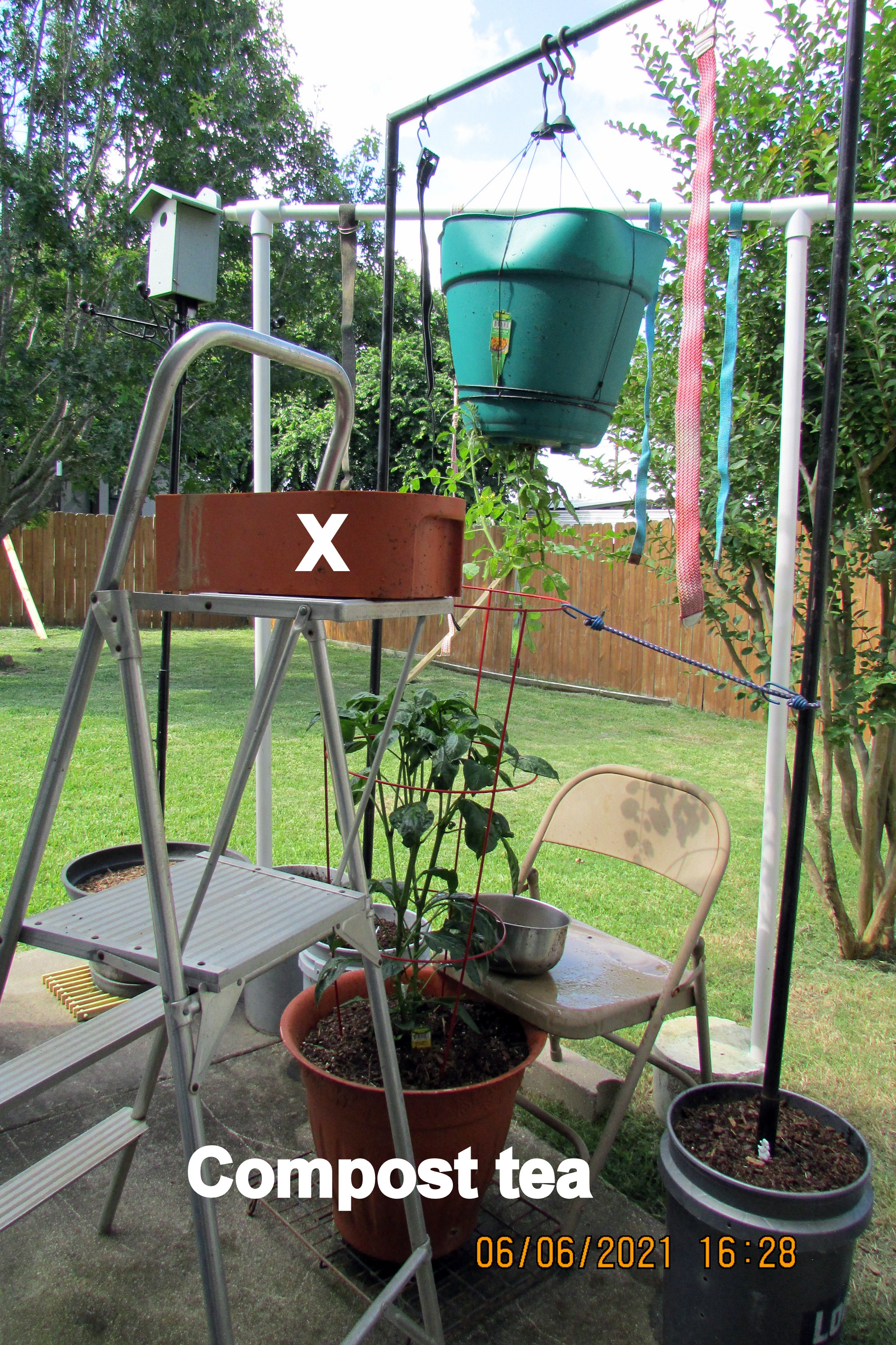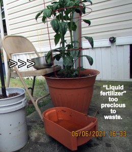 “Compost tea” is liquid gold. It collects in the bottom of the Garden Tower and has the nutrients from organic soil, decomposing vegetable scraps, and earthworm poop. I climb the ladder and pour the “tea” into the upside-down Topsy-Turvy tomato planter. Some… runs through… and I collect in the pan. I can’t have the Bell Pepper plant directly under the tomato plant because each one needs its own space. ~~ “Obsessive-compulsive”; I can’t stop.
