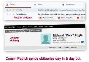 I was feeling good about my detective skills until I encountered a MAJOR discrepancy. I don’t have a subscription to sites with obituaries so I reached out to the cousin who showers me with obituary information. Within a couple of hours, I received a copy of the newspaper obituary I requested. I was astonished to see that it contradicts the information I have documented with Ancestry.com sources. This reminds me of Rod Serling and the Twilight Zone. ~~~ It’s midnight and I’ve been researching this family for fifteen hours!! Time to go to bed but my mind will be wide awake attempting to resolve the peculiarities.