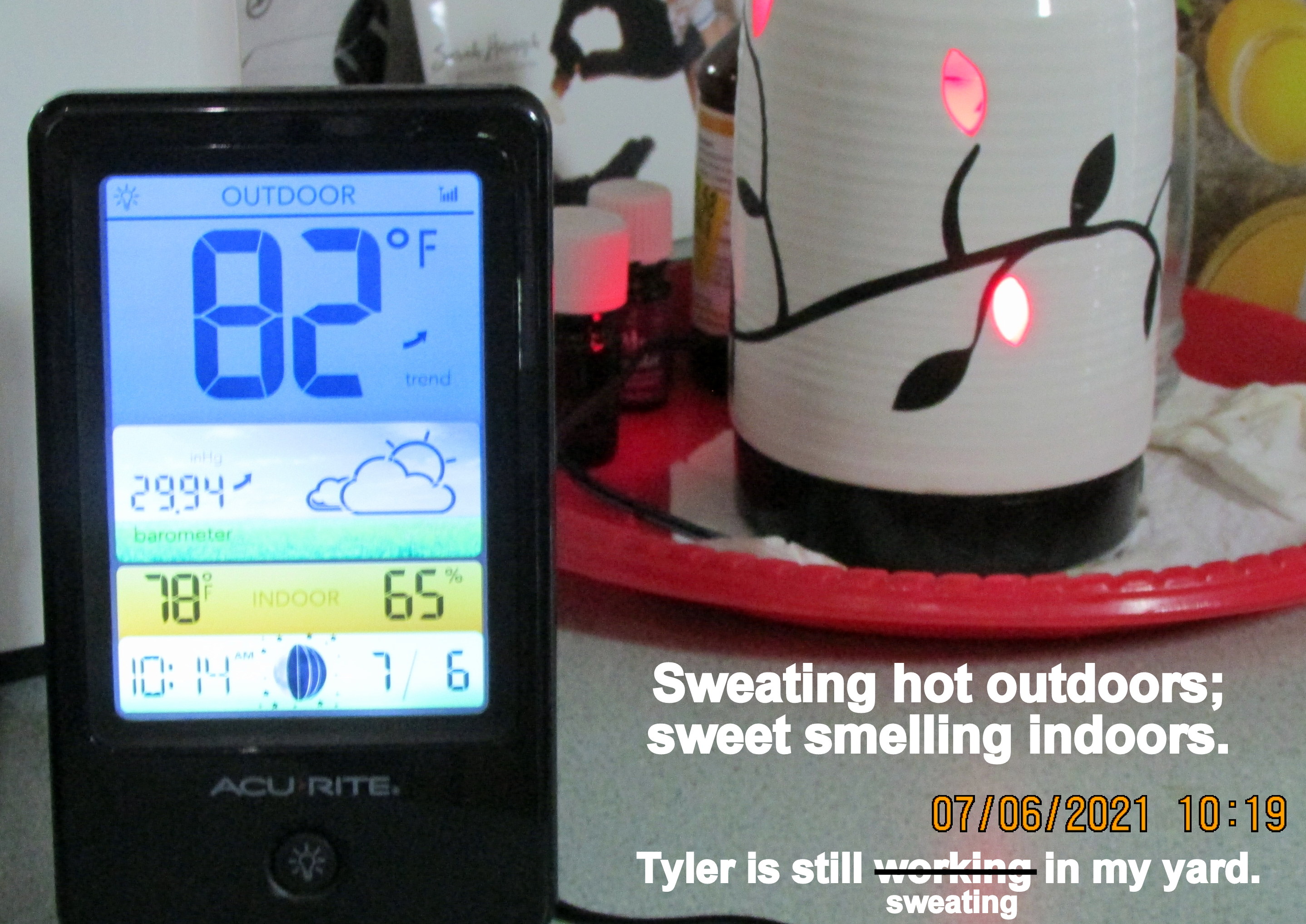 Postscript at 10:30 AM: Lorraine is “wimpy, wimpy, wimpy”!! The heat and humidity are unbearable. She prefers a pleasant temperature indoors and the sweet smell of essential oils.