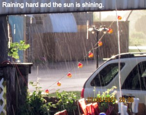 Old saying Jul10 by Lorraine Frantz Edwards Have you heard it? “Raining and the sun is shining, rain this time tomorrow.” Today, above — yesterday, below. Here are two links: Weather proverb and weather proverbs. Yes, they missed one. This link: Very interesting weather details. Share this: Click to share on X (Opens in new window) X Click to share on Facebook (Opens in new window) Facebook Like Loading...