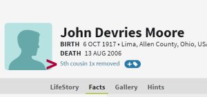 Armed with the name of the volunteer—John D. Moore II—I started a brand-new Ancestry search. It was like a stab-in-the-dark to ask for a name without supporting information. To my amazement, the immediate response was my own Ancestry database. “How does he ‘fit’ on my tree?” The answer appears in the ancestry chart above. Quite possibly, the Find A Grave volunteer is the son of John Devries Moore.