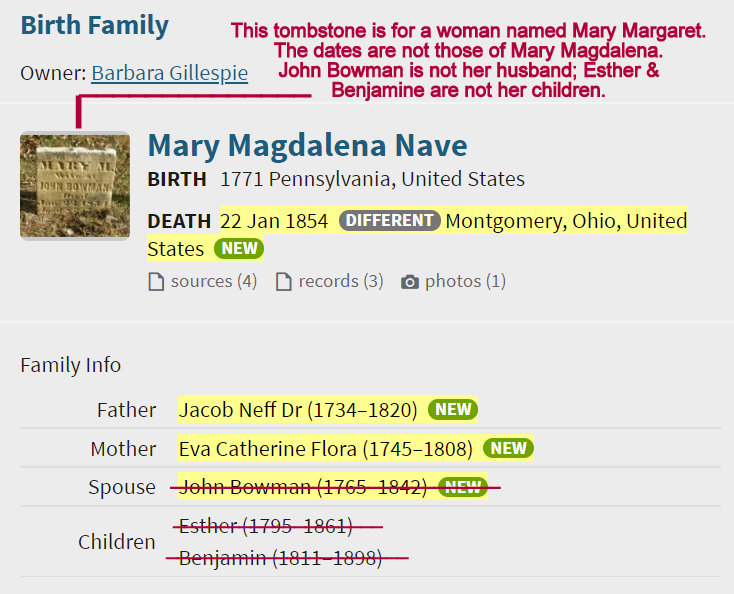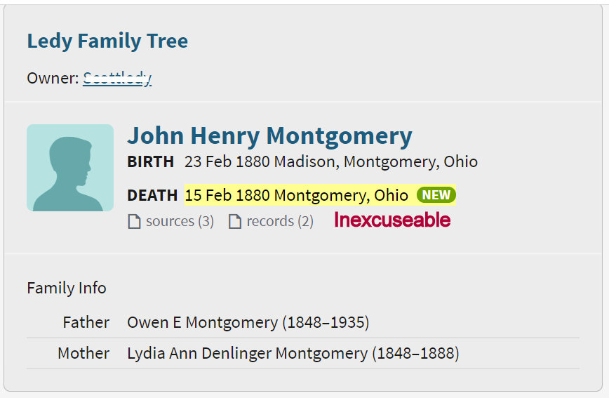 I get “involved” with a research project and I can’t walk away!! This “mell-of-a-hess” was a challenge to unravel. All this because “cousin” sent a comment regarding an individual in my database. The problem stems from Ancestry Member Family Trees copying from one another rather than studying a record to see if names—and dates—are accurate. Below is something I labeled “inexcusable” (and [shame on me] I misspelled the word in the image).