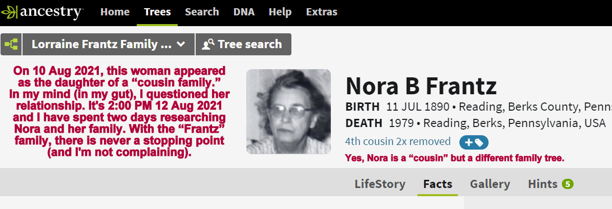 Seriously, the Frantz/Brubaker/Blocher marriages were a nightmare to unravel. Somewhere in the past, I copied from another Ancestry Family Tree. It contained many errors so (recently) I spent days working with the **sources** for these several families. I believe my information is completely accurate. ~~ With time, I’ll add more references to Frantz Families–Kith & Kin with volume and page number. ~~ Suggestion to fellow researchers: Check and double-check dates. Don’t ascribe the birth of a child to a wife that is dead. Don’t have the same individual child listed two or three times under the parents. (Example: Two… named Noah, one name Elias and one named Eli but both Elias and Eli have the same birth date.) ~~ Forgive me for preaching but I get so frustrated with the errors!! ~~ My method of research: Only use “sources”; ignore the Ancestry Member Trees. Or, when all else fails, use the Ancestor Member Tree for reference information (write it on a piece of paper). Then search for birth, marriage, death, Census, etc. ~~ In my humble opinion, NEVER import Ancestry Member Tree data into your personal database. (Mine might be the exception? )