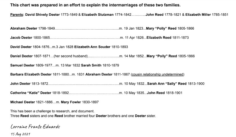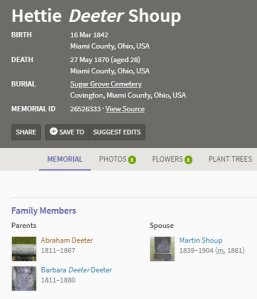 Here’s the “back story”: Several days ago I found “Hettie” Deeter (1842-1870) attached to two different sets of parents. While researching the families, I stumbled on the marriages of siblings in one family to siblings in another family. ~~ The same surname but different branches of the tree.