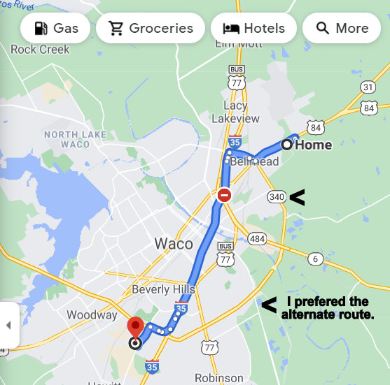 Yesterday, an appointment with an eye doctor (after weeks of waiting). On Sunday evening, I consulted Google maps and had foreknowledge of where I was going. I was en route at 7:30 because I had been instructed to be there at 8:00. I wanted the alternate route but the woman’s voice on my Garman went ballistic saying “recalculate.” She was insistent that I go to I35. Honestly, Waco traffic terrifies me and the 340 Loop is (perhaps) as busy as the Interstate. Construction on I35 makes traffic a nightmare!! #1: I have anxiety just leaving home; #2, Waco traffic terrifies me; #3, Garman was extremely unsatisfactory!! I didn’t write down the mileage at my destination but undoubtedly more than the originally indicated “eighteen miles.”