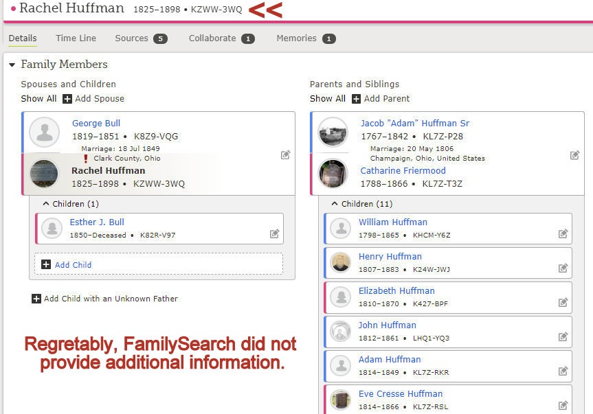 This is an interesting observation by an astute Frantz-family researcher. The name “Rachel Bull” was first observed while documenting George Grisso in the 1870 Federal Census. No relationship listed for Rachel (while looking at George Grisso’s record). Later, it was noted that Rachel Huffman Bull was the sister of George Grisso’s first wife Eve Huffman (1815-1866). In the transcribed record for the 1870 Federal Census, Rachel is listed as “domestic servant.” More specifically, Rachel was George Grisso’s sister-in-law. Rachel’s daughter Esther J Bull (1850- ) is listed as a “domestic servant” in the 1870 Federal Census, in the home of Catherine Huffman Mellinger but Esther J. Bull is the niece of Catherine Huffman.